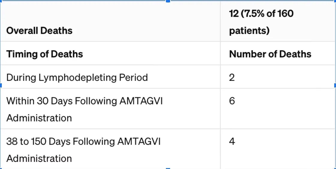 Out of the original 160 people who received the treatment, ultimately only 73 patients were a part of the main analysis of how well AMTAGVI worked, less than half of the original.