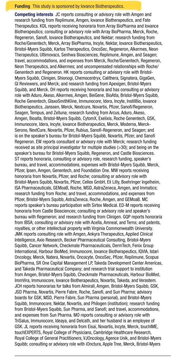 Conflicts of Interests and the Study Authors Buried under hyperlinks and almost deliberately difficult to navigate to are conflict of interest statements. Each author listed has to provide what they feel could be perceived as a conflict of interest. Meaning some other source of income or association that given the study subject could potentially have influenced them in some way. Perhaps a charitable interpretation of data, a study design flaw, a questionable methodology, potential financial incentives or social incentives. The list of potential conflicts is too numerous to print here. With that under consideration and also keeping in mind the data we just went through, I invite you to get to know 21 authors who are credited with the studies while weighing their COI’s with the data as well as the potential career/financial incentives. After you’ve done so, ask yourself, “if I had this stage of melanoma, how confident would I be accepting this treatment?” The story is yet to be told since it has already been approved based on short term data. I guess the public is the price gauged guinea pig at this point and that my friends, is the point.