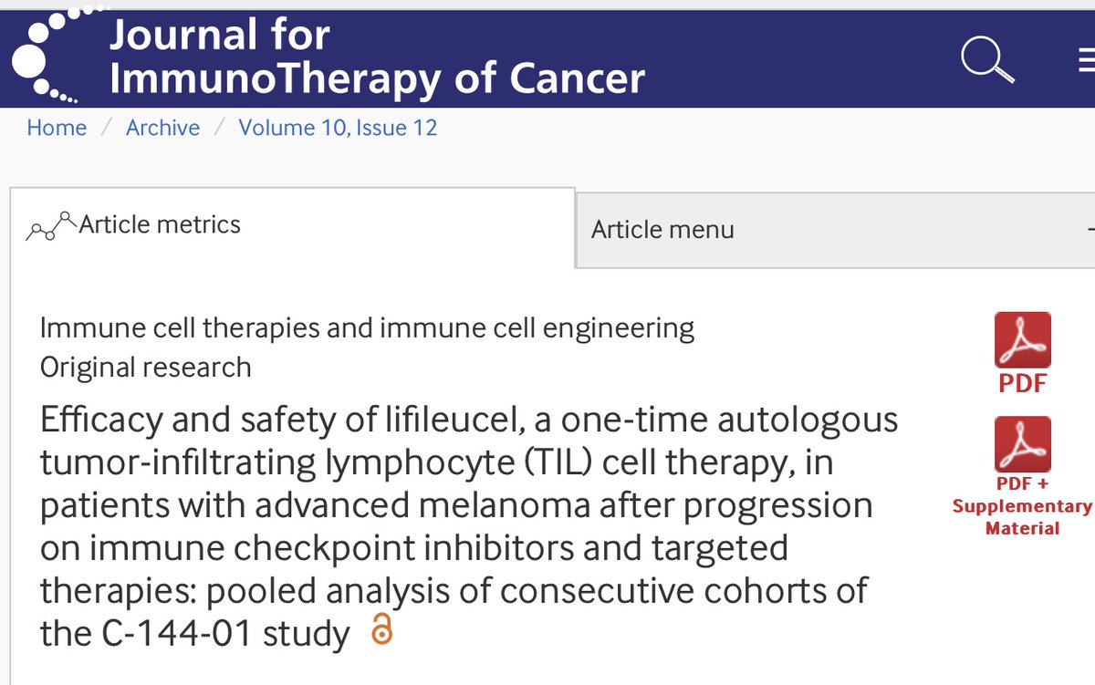 Author Conflicts of Interest Statements JASON CHESNEY Consulting or advisory role with Amgen. Research funding from Replimune, Amgen, Iovance Biotherapeutics, and Fate Therapeutics. KARL D. LEWIS Received honoraria from Array BioPharma and Iovance Biotherapeutics. Consulting or advisory role with Array BioPharma, Merck, Roche, Regeneron, Sanofi, Iovance Biotherapeutics, and Nektar. Research funding from Roche/Genentech, Merck, Array BioPharma, Incyte, Nektar, Iovance Biotherapeutics, Bristol-Myers Squibb, Kartos Therapeutics, OncoSec, Regeneron, Alkermes, Neon Therapeutics, Ultimovacs, Senhwa Biosciences, Replimune, Amgen, and Seagen. Travel, accommodations, and expenses from Merck, Roche/Genentech, Regeneron, Neon Therapeutics, and Alkermes. Uncompensated relationships with Roche/Genentech and Regeneron. HARRIET KLUGER Consulting or advisory role with Bristol-Myers Squibb, Clinigen, Shionogi, Chemocentryx, Calithera, Signatera, GigaGen, GI Reviewers, and Merck. Research funding from Apexigen, Bristol-Myers Squibb, and Merck. OMID HAMID Received honoraria and consulting or advisory role with numerous pharmaceutical companies, including Aduro, Akeso, and Amgen. Research funding from several companies, including Arcus, Aduro, and Amgen. Speaker’s bureau for Bristol-Myers Squibb, Novartis, Pfizer, and Sanofi Regeneron. Eric Whitman Consultant or advisory role with Merck. Research funding received as site principal investigator for multiple studies. Speaker’s bureau for Bristol-Myers Squibb, Regeneron, and Castle Biosciences. Sajeve Thomas Honoraria, consulting or advisory role, research funding, speaker’s bureau, and covered travel expenses with companies like Bristol-Myers Squibb and Merck. Martin Wermke Received honoraria from Novartis, Pfizer, and Roche. Consulting or advisory role with a list of companies including Bristol-Myers Squibb and Novartis. Research funding from Roche. Travel and expenses from Pfizer, Bristol-Myers Squibb, AstraZeneca, and others. Mike Cusnir Speaker’s bureau participation with Sirtex Medical. Evidio Domingo-Musibay Received honoraria from Castle Biosciences. Consulting or advisory role and speaker’s bureau with Regeneron. Research funding from Clinigen. Giao Q. Phan Honoraria from IBSA. Consulting or advisory role with Acella, Amneal, and Terns. Patents, royalties, or other intellectual property with Virginia Commonwealth University. John M. Kirkwood Consulting role with numerous companies including Amgen, Bristol-Myers Squibb, and Merck. Research trial support to institution from companies such as Amgen, Bristol-Myers Squibb, and Novartis. Jessica C. Hassel Received honoraria for talks from various companies including Almirall and Amgen. Advisory boards for companies such as GSK and MSD. Research funding from Bristol-Myers Squibb, Sun Pharma, and Sanofi. Travel, accommodations, and expenses from Sun Pharma. Marlena Orloff Consulting or advisory role with TriSalus, Immunocore, Ideaya, and Delcath. Her husband is an employee of GSK. James Larkin Received honoraria from companies including Eisai and Novartis. Consulting or advisory role with companies such as iOnctura and Merck. Research funding from Bristol-Myers Squibb, MSD, Novartis, and others. Travel, accommodations, and expenses from Pierre Fabre, Roche, and GSK. Jeffrey Weber Owns stock or other ownership interests in Biond, Instil Bio, OncoV4, and Evaxion. Honoraria and consulting or advisory role with companies including Bristol-Myers Squibb and GSK. Research funding from Bristol-Myers Squibb, Moderna, Merck, and others. Patents, royalties, or other intellectual property with Moffitt Cancer Center and Biodesix. Andrew J.S.Furness Consulting or advisory role with Immunocore and GSK. Speaker’s bureau participation with Bristol-Myers Squibb, Ipsen, and Eisai. Travel, accommodations, and expenses from ESMO. Nikhil I. Khushalani Owns stock and other interests in companies like Bellicum Pharmaceuticals. Consulting or advisory role with several companies including Bristol-Myers Squibb and AstraZeneca. Research funding from Bristol-Myers Squibb, Merck, Novartis, and others. Theresa Medina Consulting or advisory role with companies including Merck, Bristol-Myers Squibb, and Iovance Biotherapeutics. Michael E.Egger Consultant or advisory role with Iovance Biotherapeutics. Research funding from SkylineDx. Friedrich Graf Finckenstein, Madan Jagasia, Parameswaran Hari, Giri Sulur, WenFriedrich Shi, and Xiao Wu Are employees of Iovance Biotherapeutics and hold stock and/or stock options. FGF is in a leadership position at Iovance Biotherapeutics; owns stocks from other biotech and pharmaceutical companies; and holds patents or other intellectual property. PH additionally received honoraria and has been paid for consultant or advisory roles by various companies and received travel accommodations from others. Amod Sarnaik (Corresponding Author) Received honoraria and consulting or advisory roles with Iovance Biotherapeutics and other consultancies. Holds patents, royalties, or other intellectual property with institutions like Moffitt Cancer Center. Nothing to see here.