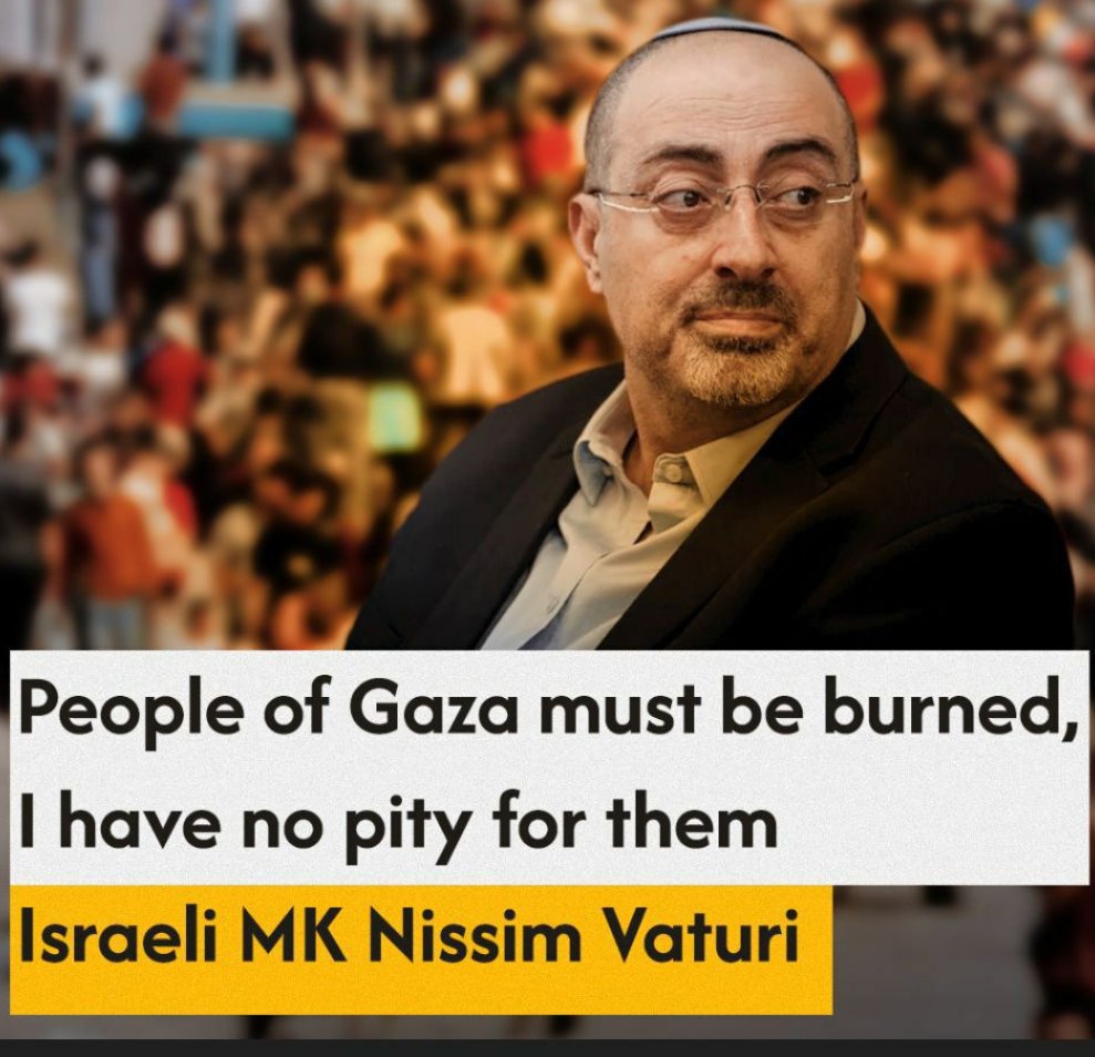 Le député israélien Nissim Vaturi "Gaza et ses habitants doivent être brûlés, je n'ai aucune pitié pour eux." Quelle humanité, quelle bonté , que d'amour ... Décidément je ne cesserai d'être étonné par cette haine qui dépasse l'entendement ! Brûlés des gens 🤔 #Israel #Gaza https://t.co/hQRI6Ruspr
