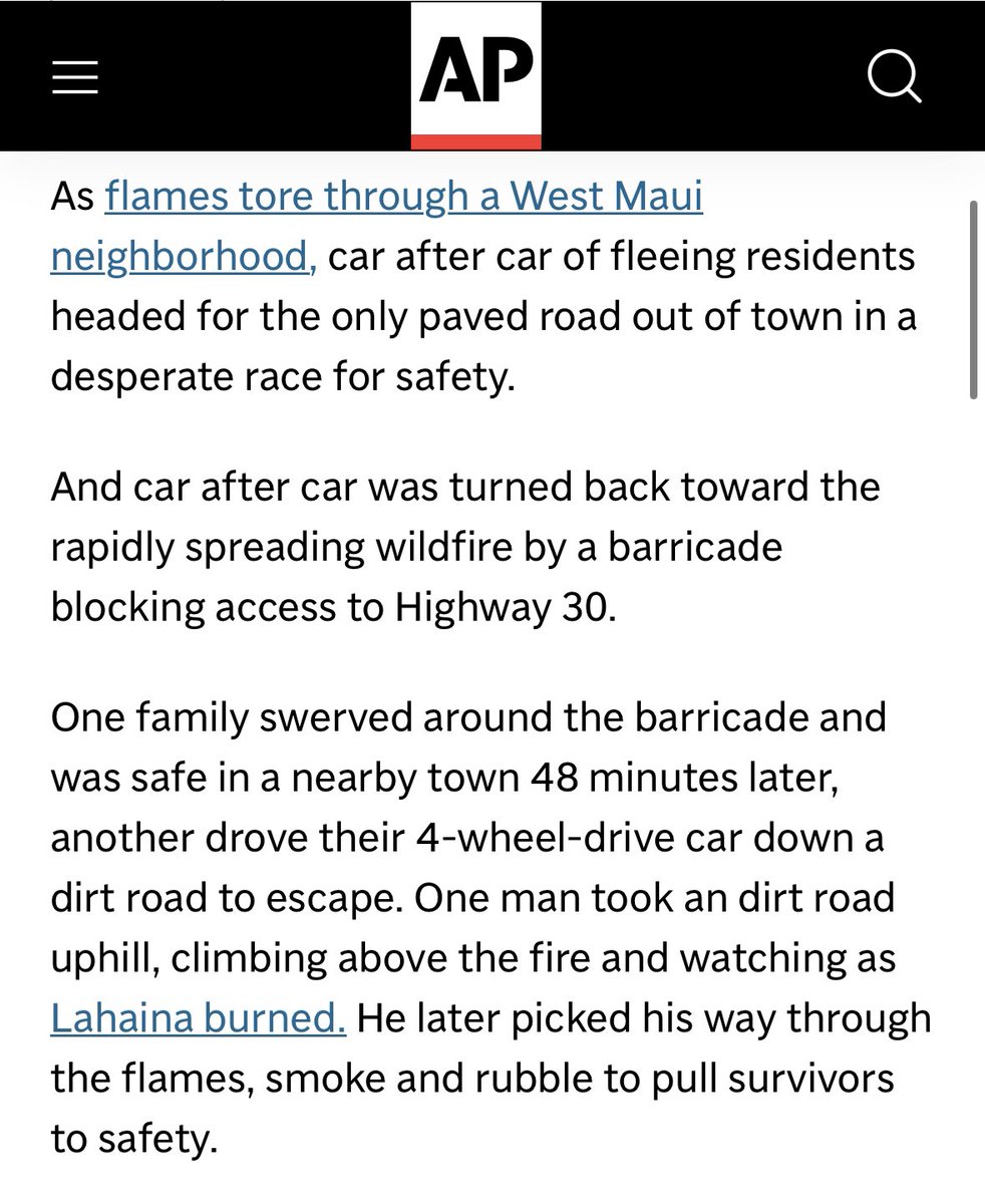 According to a report by AP, the only road out of Lahaina was barricaded. Only those who disobeyed survived.