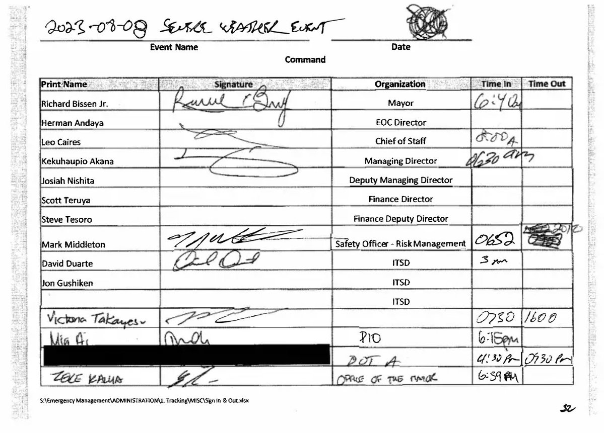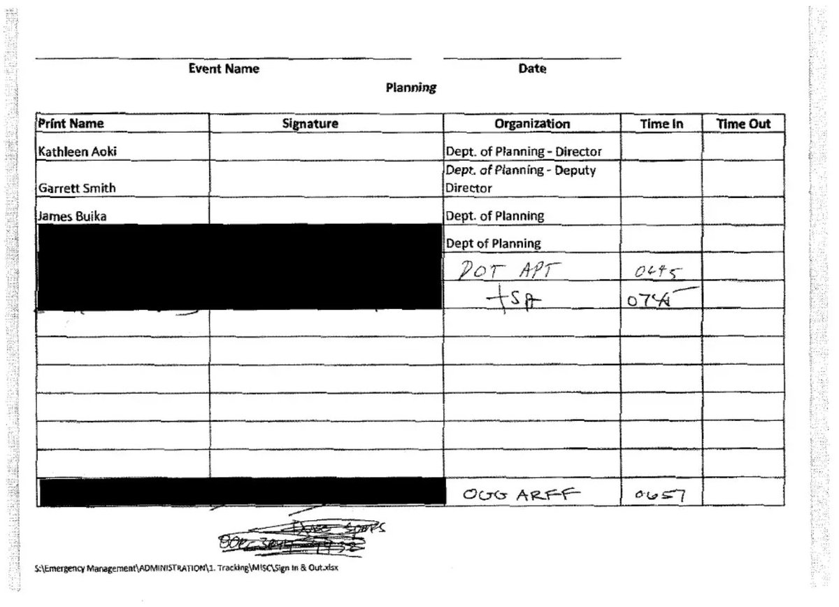 🚨 MASSIVE RED FLAGS: HAWAII GOVERNMENTS CENSORING WHO WAS CONTROLLING MAUI FIRE RESPONSE 🚩 After 5 MONTHS of fighting with the government, they've released a HEAVILY redacted sign-in sheet of Maui’s Emergency Ops Center for the day Lahaina was incinerated. THEY'RE HIDING 20 OF THE 38 PEOPLE THAT SIGNED IN. WHY? ❗️ Some of these identities are extremely important such as US Coast Guard officials, who didn't bother rescuing anybody that fled to the ocean for SEVERAL HOURS. Why can’t the people of Maui know WHO made the decisions to block the exits resulting in the deaths of COUNTLESS people? WHO WAS HOLDING UP RESCUE RESOURCES FOR THE TOWN? Maui County so far has REFUSED to respond to any inquiries regarding who was in charge that day. Weirdly enough, out of 38 people that signed in that day, 24 never signed out, including Mayor Richard Bissen, Hawaiian Electric reps, Maui fire & police, and others. Experts are saying this is a HUGE red flag, saying these records are not just censored, but they're also INCOMPLETE. WHAT ARE THEY HIDING?