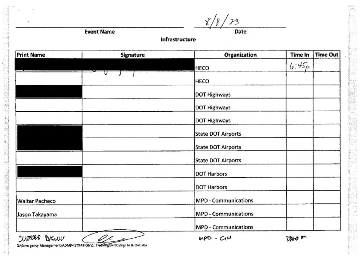 The remaining three pages that Maui County partially released include redacted names from: 🔳 US Coast Guard 🔳 TSA 🔳 Hawaii National Guard 🔳 Hawaii Air Rescue Fire Fighting unit 🔳 Dept. of Land & Natural Resources 🔳 Dept. of Planning 🔳 Hawaii Electric Company https://t.co/8tNekdvuiK