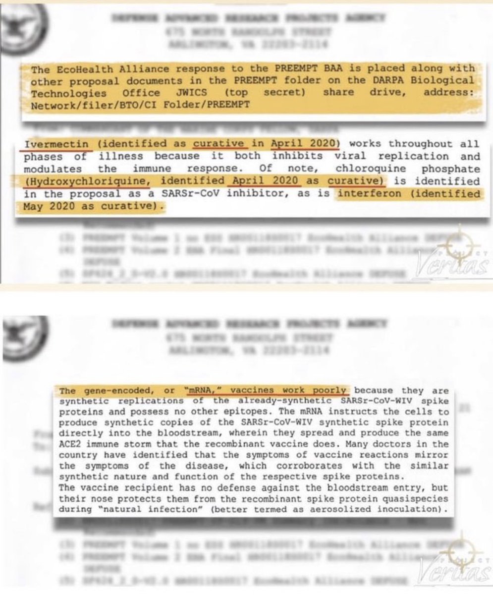 So, there was a nice man named James Okeefe @OKeefeMedia who did extensive research and got a FOIA request to see what our government knew about Covid and the mRNA vaccine. He received the documents, posted them online and his account was suspended. I guess Fauci's daughter working for old Twitter had something to do with it. What did he find you may ask? Well, he found out our government aka DARPA knew way back in early 2020 that Ivermectin, Hydroxychloroquine and interferon were curative against Covid-19. This means they cured covid. You can request the same information via a FOIA.
