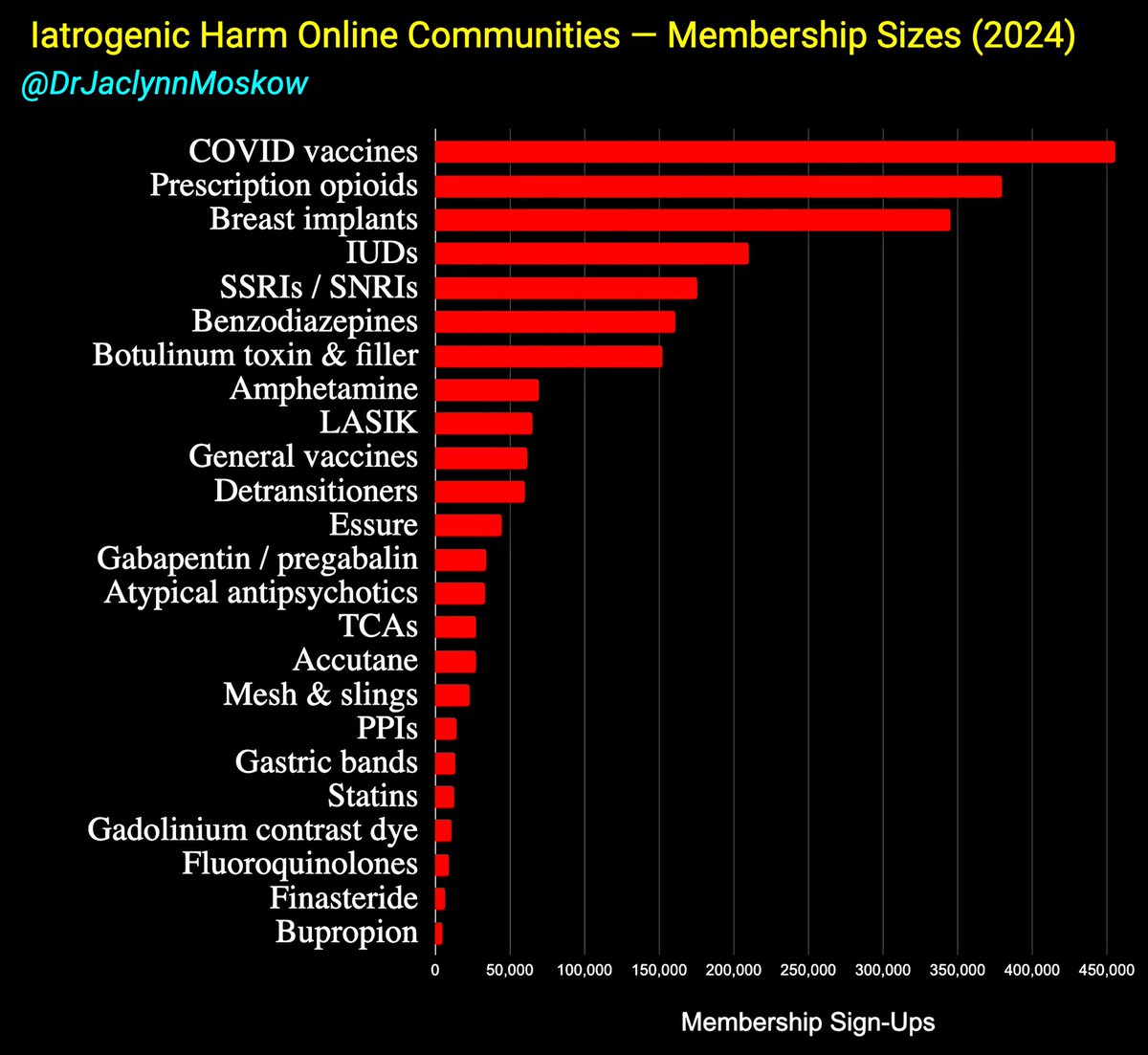 AND MORE HARM COMMUNITIES: 12) Essure contraceptive (pulled from market) — FB groups for complications, support, & litigation → 45,000+ membership sign-ups 13) Gabapentin / pregabalin — FB groups for harm & withdrawal, plus r/gabapentin with focus on “issues”, plus discussion on other psych & neuro med forums → 34,000+ membership sign-ups 14) Atypical antipsychotics — FB groups for harm, plus some representation on SurvivingAntidepressants & other forums → 33,000+ membership sign-ups (it seems many individuals who take or have taken atypicals feel their side effects are/were “necessary” vs that they are/were harmed — I will get into this more another day!) 15) Tricyclic antidepressants (TCAs) — FB groups for withdrawal & harm, mostly specific to amitriptyline, plus some representation on SurvivingAntidepressants & other forums → 27,000+ membership sign-ups 16) Accutane / Isotretinoin — FB groups for long-term side effects & subreddit for recovery → 27,000+ membership sign-ups 17) Transvaginal & hernia mesh, bladder slings — FB groups for injury → 23,000+ membership sign-ups 18) Proton pump inhibitors (PPIs) — FB groups for harm → 14,500+ membership sign-ups 19) Gastric bands — FB groups for harm → 13,500+ membership sign-ups 20) Statins — FB groups for harm→ 13,000+ membership sign-ups (this number would be much larger if more people realized that some of the symptoms they attribute to disease, aging, genetics, bad luck, etc are actually being caused by statins — this is outside the scope of today’s data dump — we’ll “go there” soon!) 21) Gadolinium contrast dye — FB groups for harm, plus a community on groups(dot)io → 11,000+ membership sign-ups (my brilliant clinician friend says this category of harm is massively under-recognized) 22) Fluoroquinolone antibiotics — FB group for toxicity → 9,000+ membership sign-ups 23) Finasteride — propeciahelp(dot)com, plus small FB group & discussions of PFS on r/PSSD → 7,000+ membership sign-ups 24) Bupropion — some harmed patients go to general anti-depressant help groups, plus FB groups for drug-specific harm → 5,000+ membership sign-ups Now for discussion time! ↓↓↓