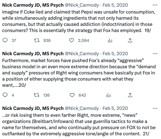 Thread about the "demand and supply" dynamic that forced FOX to perpetuate lies/disinformation to avoid being outflanked by more aggressive Right Wing media outlets: 1/ https://t.co/OjiH4s5cqQ