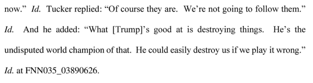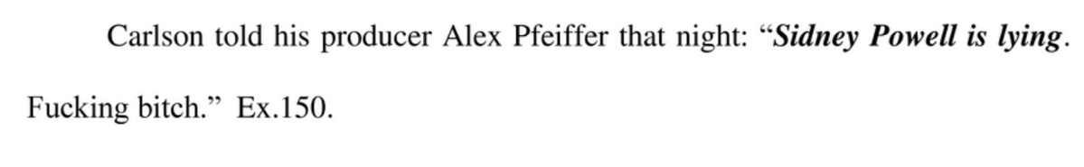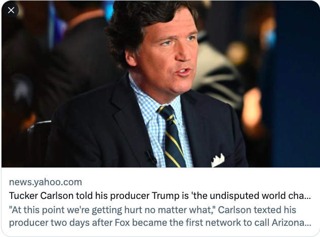 Tucker Carlson emerges in the the court filing as absolutely freaking out after the election— hearing from angry viewers and worrying that Fox calling AZ for Biden will kill his golden goose, while also afraid "fucking bitch" Sidney Powell has gone too far.