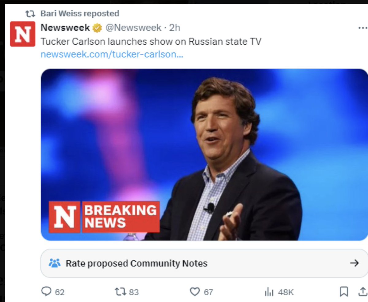 This original Newsweek headline predictably went viral, claiming Tucker Carlson has "launched" a new program on Russia state TV. The "edited" article now makes clear the whole story is bullshit -- false -- but it was an irresistible McCarthyite smear: https://www.newsweek.com/tucker-carlson-launches-show-russian-state-tv-russia-24-1903045#:~:text=A%20show%20from%20former%20Fox,is%20broadcast%20on%20Russia%2024.