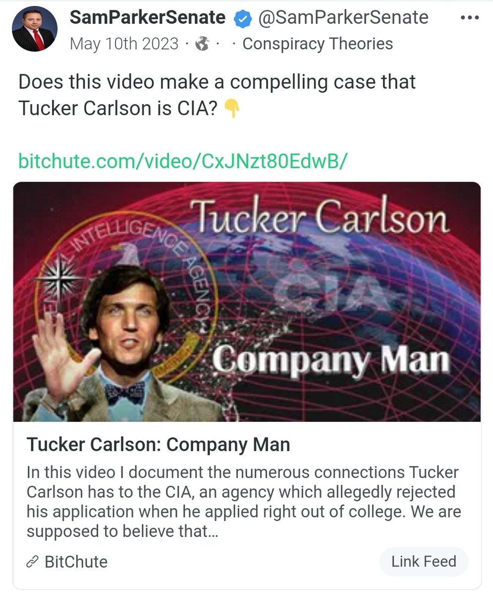 2/ To be clear, the info in the "Tucker Carlson Company Man" video has been publicly known for decades. That video put it all together and made it digestible to the masses. You can find it by following my Gab link: https://gab.com/SamParkerSenate/posts/110347283262710429