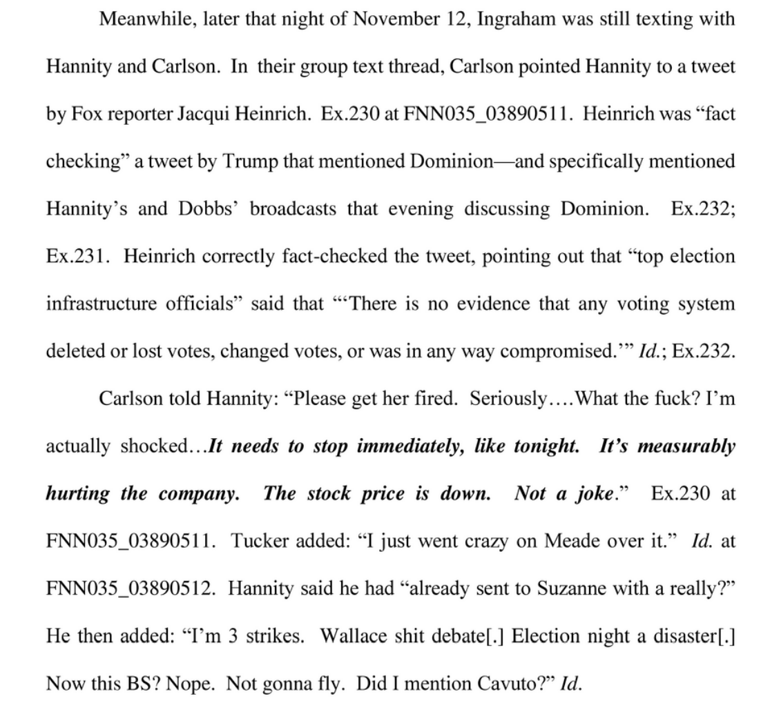 A FOX reporter fact-checked Trump and said there was no evidence of voter fraud from Dominion. Carlson told Hannity: "Please get her fired. Seriously...What the fuck?...It needs to stop immediately, like tonight. It's measurably hurting the company. The stock price is down." 2/