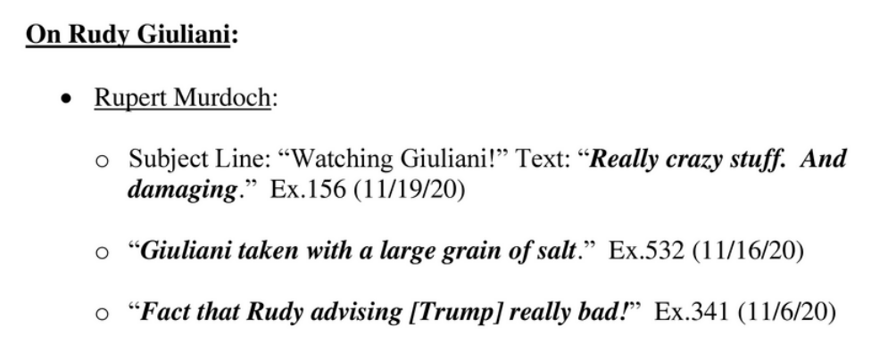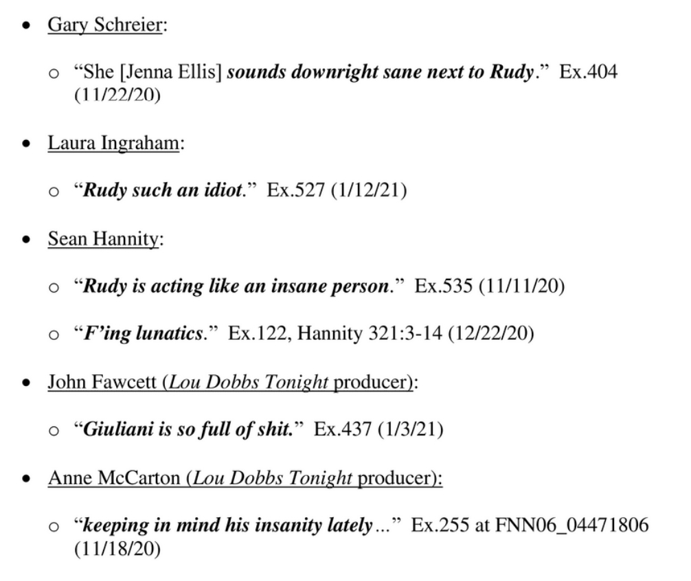 The Fox messages reveal Fox brass and top hosts tearing into Rudy Giuliani. Hannity: Rudy's "an insane person." Ingraham: "Such an idiot." Murdoch: "Really crazy stuff."