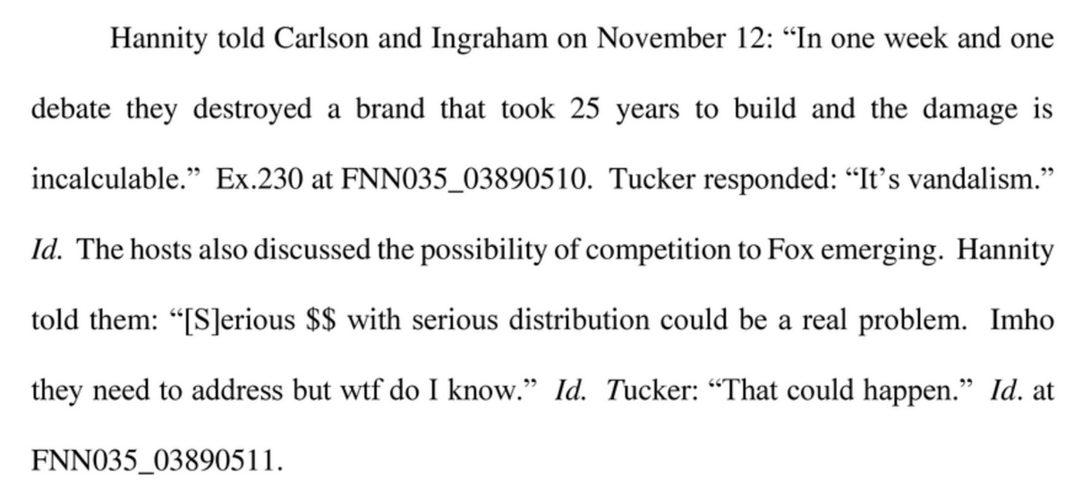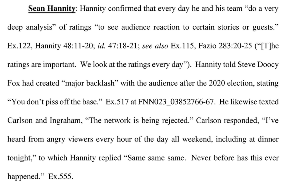This filing in the Dominion lawsuit against Fox News is one of the most remarkable documents I've ever seen. Filled with private texts between Fox stars like Hannity and Carlson, plus Murdoch, all admitting they knew Fox's stolen election claims were lies. https://int.nyt.com/data/documenttools/redacted-documents-in-dominion-fox-news-case/dca5e3880422426f/full.pdf