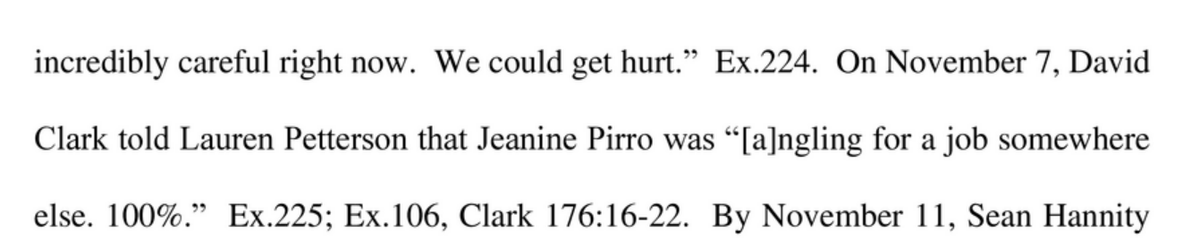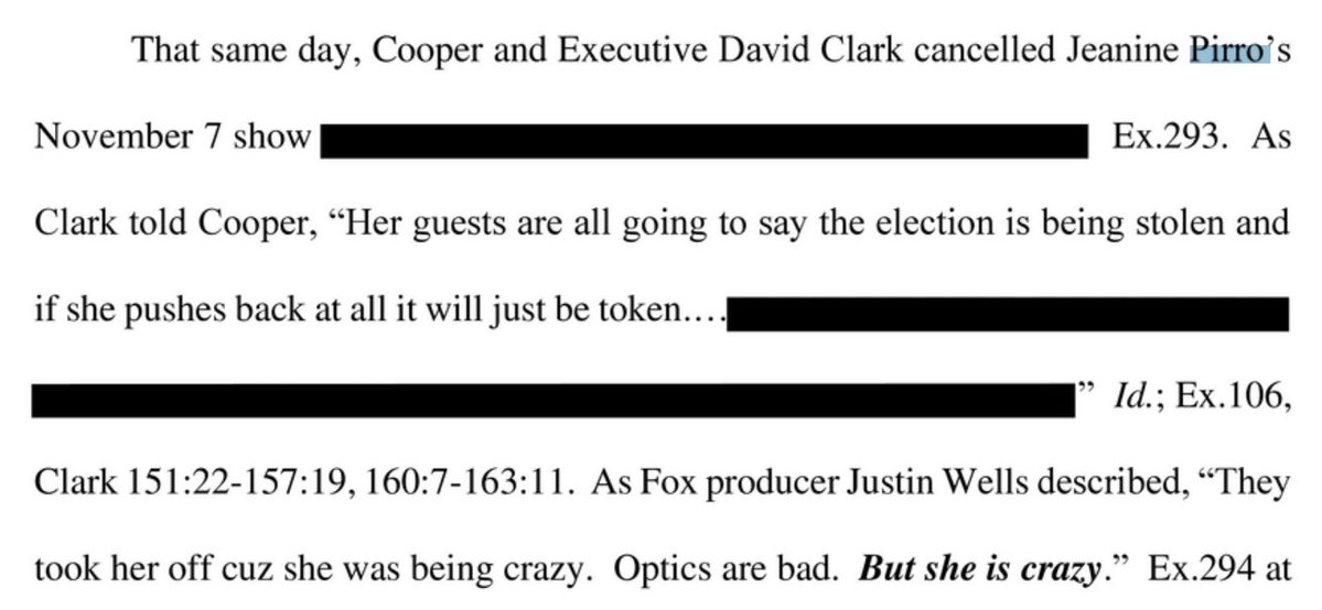 Some interesting details about Jeanine Pirro in the Fox News messages: a Fox exec felt sure she was looking for a job at a competitor like Newsmax, and Fox cancelled her Nov. 7 show because they were afraid she'd push stolen election theories: "She is crazy."