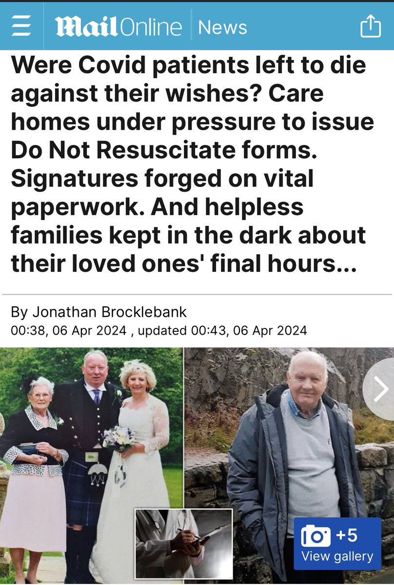 ‘There was a still more shocking sight to come. It was a piece of paper known as a Do Not Resuscitate (DNR) form for her grandmother – and Ms Grant's name was on it as the next of kin authorising it She had never authorise such a thing’ https://dailymail.co.uk/news/article-13277723/Were-Covid-patients-left-die-against-wishes.html