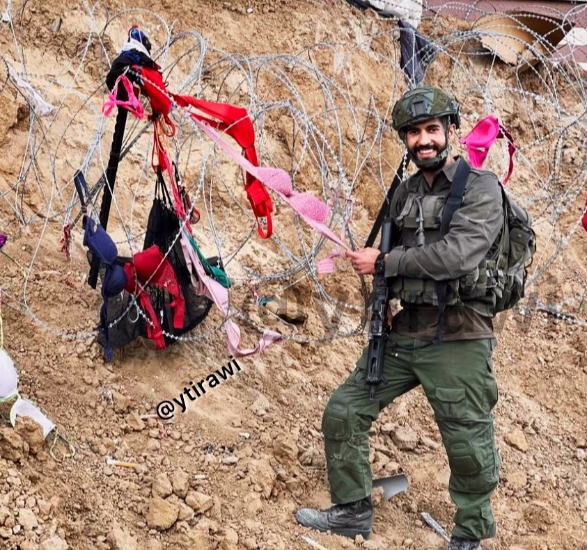 Khan Younis | Lingerie Feb 17, an Israeli soldier from the 435 Rotem Battalion (Givati Brigade) posted a picture of himself displaying women's underwear, bras, and thongs he looted from a Palestinian family he displaced/killed, hanging them on a steel wire in the city 1/2 https://t.co/hAUIv1ntMQ