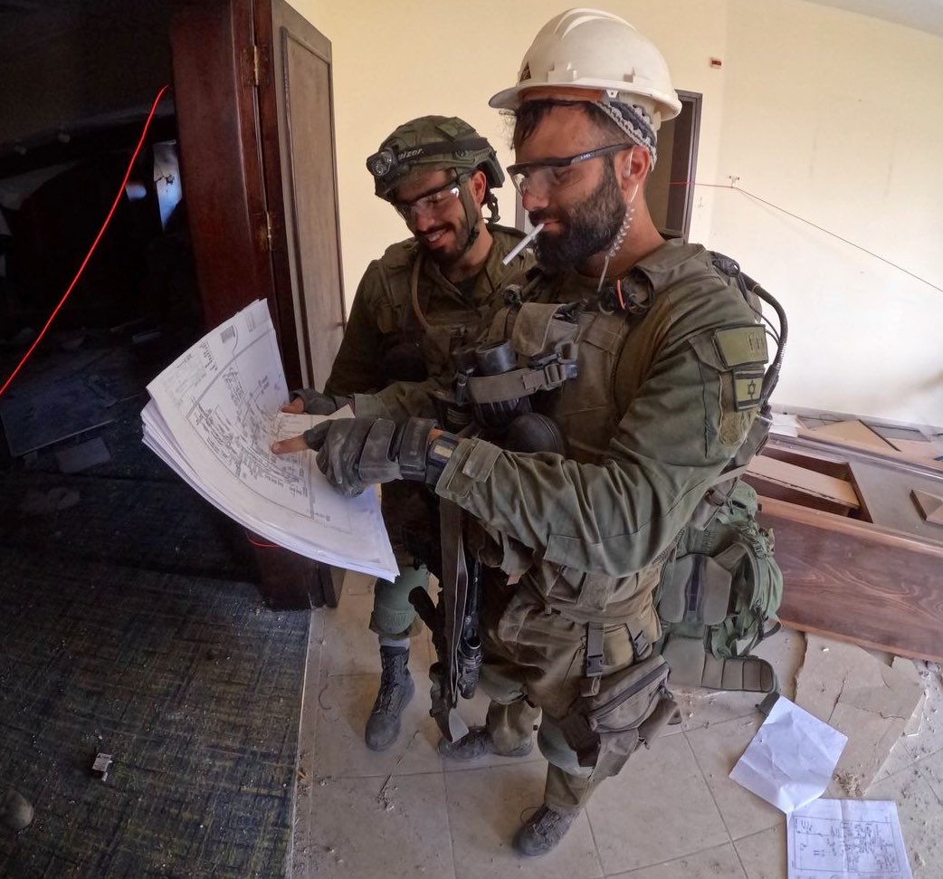 @TalulaSha Joking around and playing as civil engineers after blowing up a factory. The helmet and the papers belongs to a killed/displaced Palestinian (16/25) https://t.co/BJ8vxSMbwn