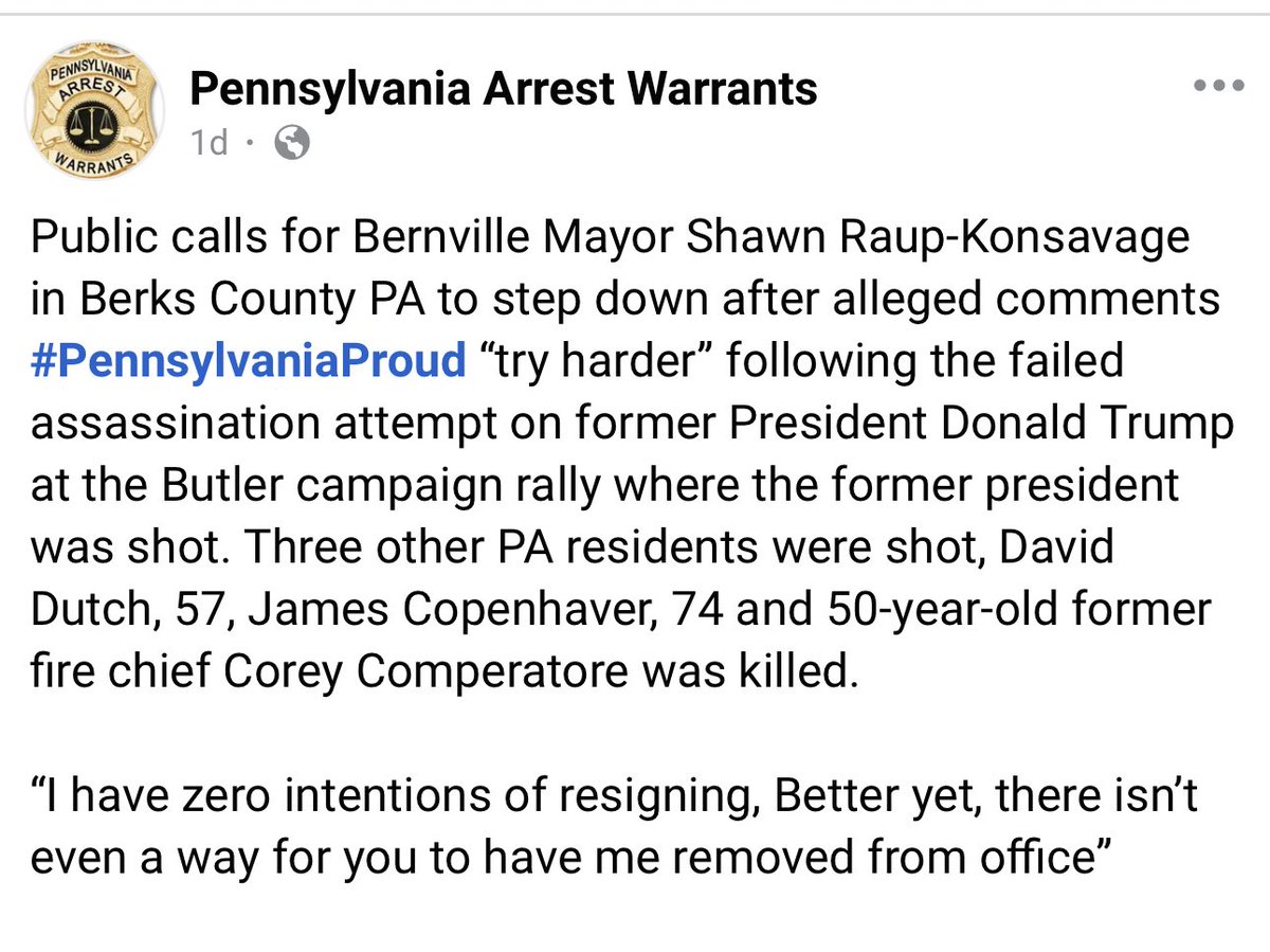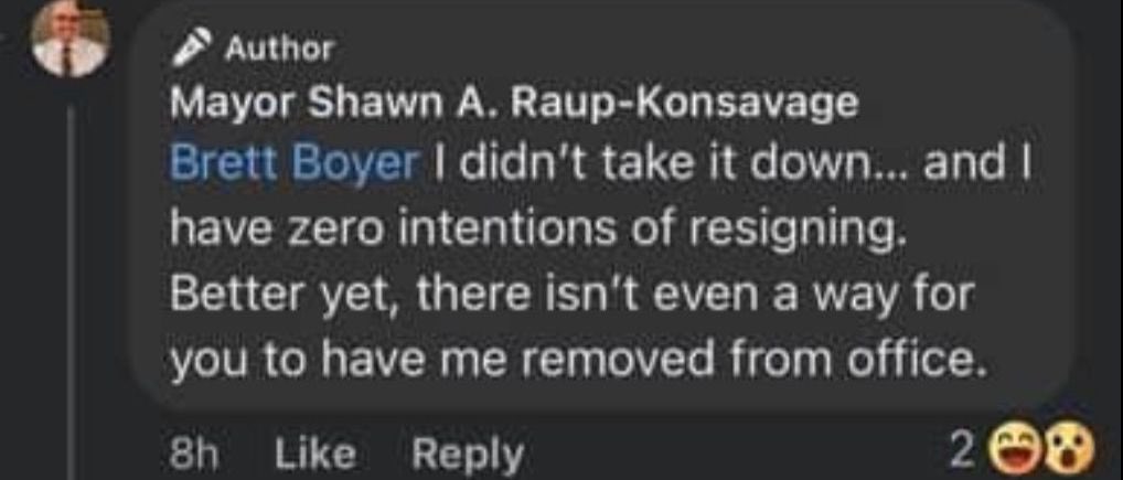 Meet Shawn Raup-Konsavage @shawnraup , the Mayor of Bernville, PA. He reportedly said “try harder” after the sh**ter missed. A petition is going around to get him removed after he allegedly bragged about no one being able to kick him out of office. Our tax dollars fund his salary.