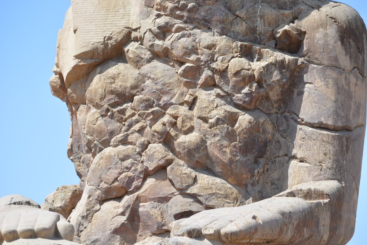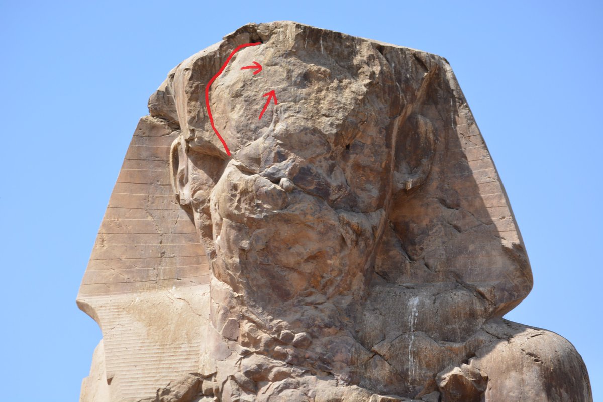 Maybe because these statues aren’t actually granite? Hmmm! Who would’ve thought (that I’d end up here again)? The Memnon Colossus is almost certainly not ‘a single stone block,’ as people like to say, but rather a messy mix of materials inside, covered with a plaster-like layer that only looks like quartzite. Just have a look at the head of the other one. This head was made like a snowman's head. Layer by layer. Haters gonna hate, but hey—come up with a better explanation! Actually, I have a better explanation... 8/9