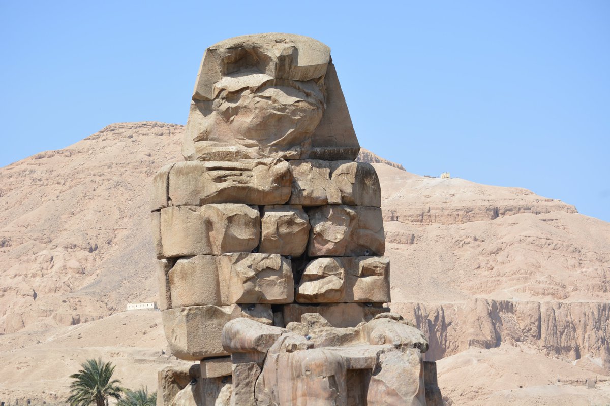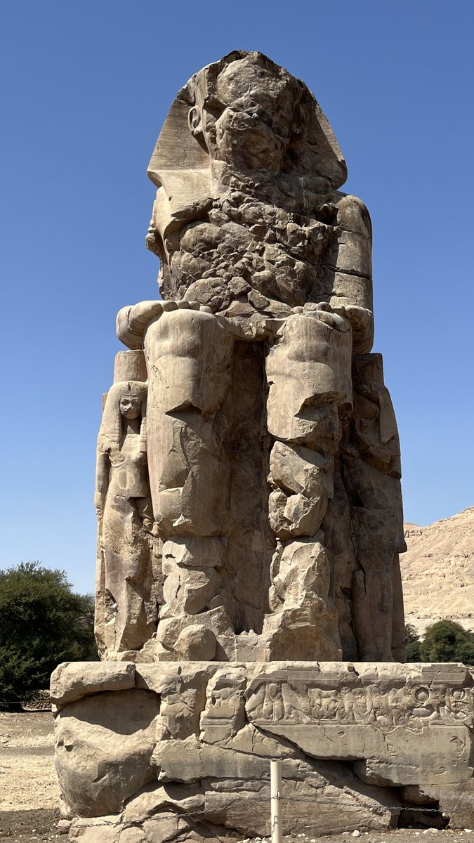 Since it just came up elsewhere today, let's take a look at this ugly face. This is one of the Memnon Colossi in Luxor—the one on the left. Its expression isn’t exactly easy to read… maybe something happened to it. But what, when, and why? (All images are in 4K—tap, tap & hold, download in 4K, and zoom in.) A 🧵 1/9