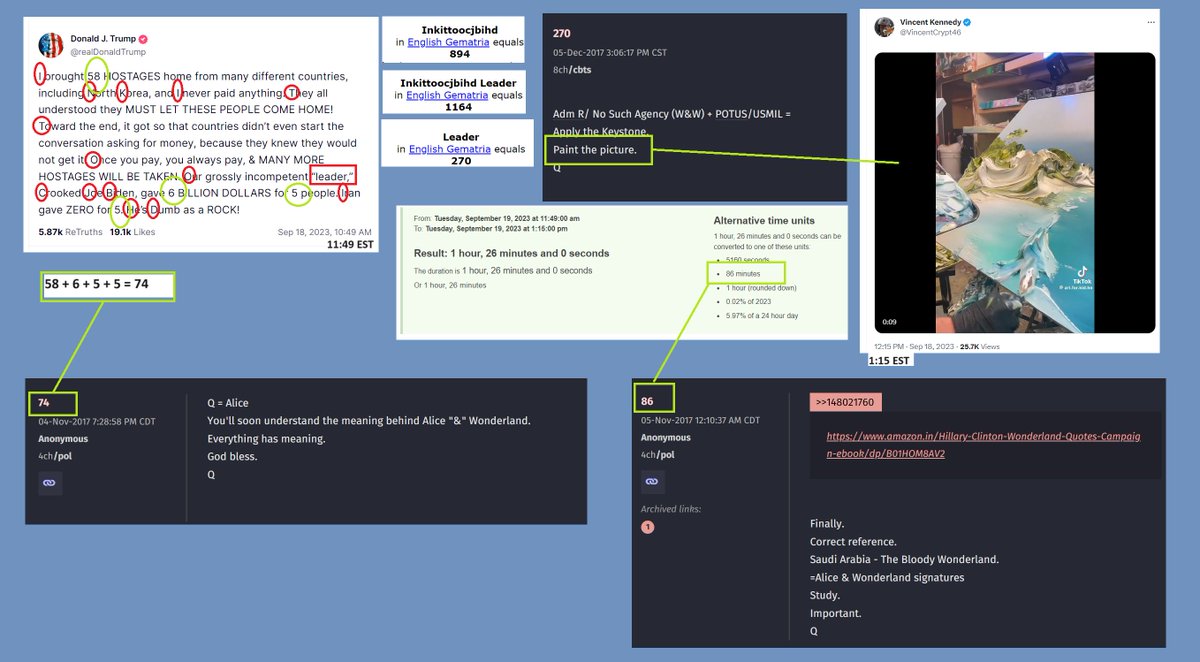 Proofs are important. It's time to WAKE UP. I believe the following messages from today were meant for me to show you the 'proofs' of Q, the code, comms, @VincentCrypt46 and perhaps add credibility/validation to me. Sometimes the messages are vague and require some thought. I think the following were meant to show crystal clear examples. Why would @realDonaldTrump want me to share this with you? The answer is because it is time. This is the Great Awakening. There are new eyes here that need to see for the first time. President Trump posted on TS at 11:49 EST. If you take the capital letters (not the words in ALL CAPS, just Like This), you get a GV (English Gematria Value) of 894. The word "leader" is also in quotations so you take the GV of that and you get 270. If a word or phrase is in quotations, you take its GV and it is most often (maybe always) a separate message. You then add everything to get the total GV of the post which is 1194. There were also numbers listed in the President's post--58, 6, 5, 5--which total 74 when added together. For this example, let's just focus on the 74 and 270. Q Drop 74: Q = Alice You'll soon understand the meaning behind Alice "&" Wonderland. Everything has meaning. God bless. Q Q Drop 270 has a line that reads, "Paint the picture." VK posted a video of someone painting a picture at 1:15 PM EST. The duration (delta) between President Trump's post a VK's post was 86 minutes. Q Drop 86: (Quoted text referencing HRC as Alice) Finally. Correct reference. Saudi Arabia - The Bloody Wonderland. =Alice & Wonderland signatures Study. Important. Q To simplify this: President Trump's post had 2 messages (for the sake of this example) 1. Paint the picture 2. Who is Alice? We then get a corresponding message from Vincent Kennedy 1. Painting the picture 2. Identifying Alice. That's about as straightforward as it gets. There will still be some that deny this. You can choose to see it or you can choose not to. If you do see it, share it. Wake up others. Unplug. Ascend. Collective consciousness. #TrumpCode #MAGA #WWG1WGA #NCSWIC #PatriotsInControl #WeThePeople