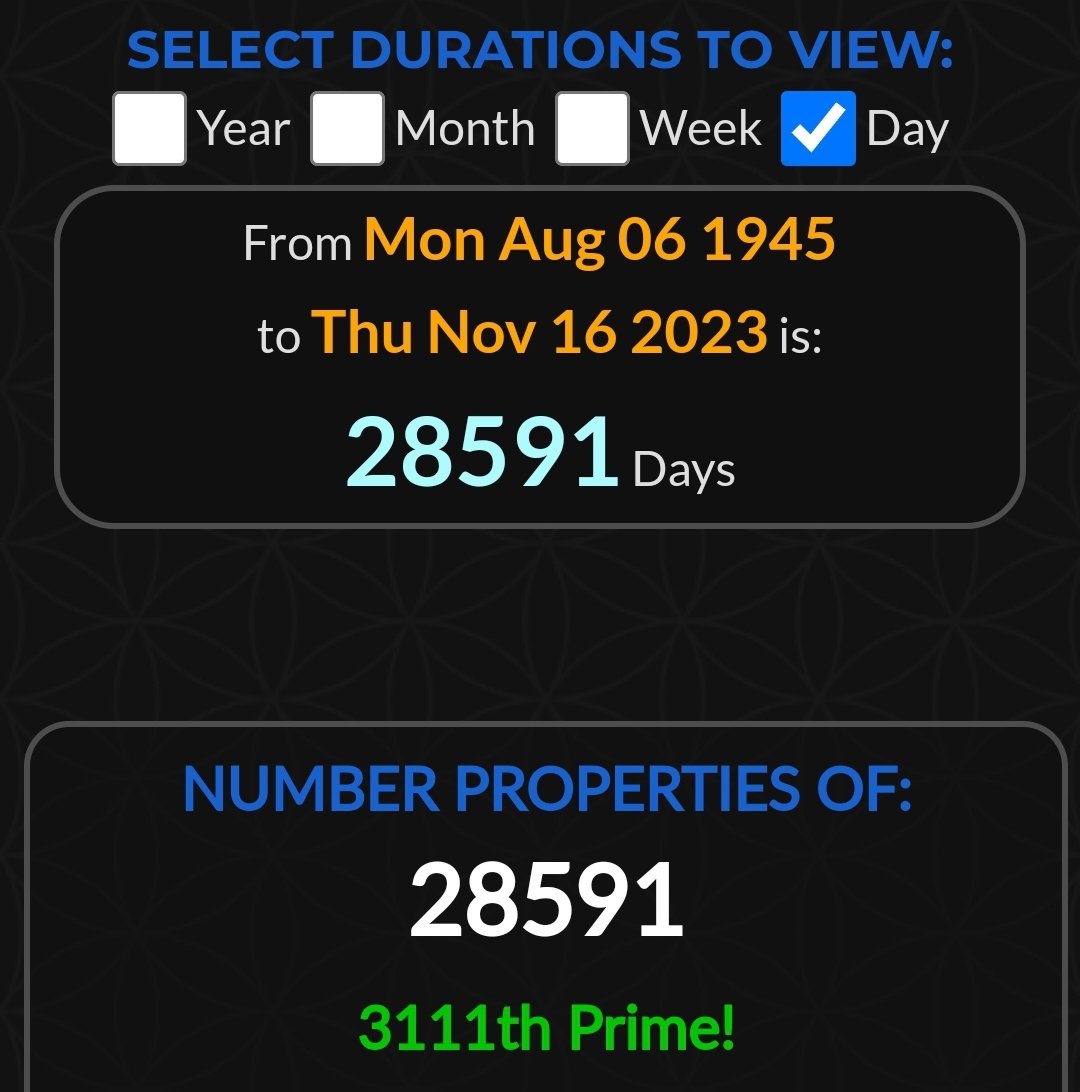 Wow, look at the day count from Hiroshima to 11/16/23 🤯🤯 🚨 28591 is the 3111th prime 🚨 3111<>11:31 Elon 'It begins...' on 7/23 11/16 is 56 days after the start of autumn 🀨 56=7×2³ Both Ikaustat and Mr Pool posted at 9:11pm. Pool's post says DOUBLE MEANING. https://t.co/Jxqwxhb3gT