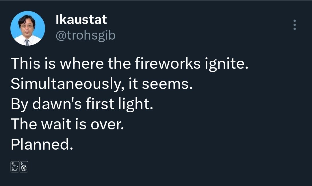 Ikaustat's gematria gives 1116 😄 It looks like this is an advance warning for 11/16, not today. This is where the fireworks ignite=364=2²×7×13 Simultaneously, it seems=296 (Pool's first post was on day #296) By dawn's first light=216=6×6×6 The wait is over=174 Planned=66=11×2×3