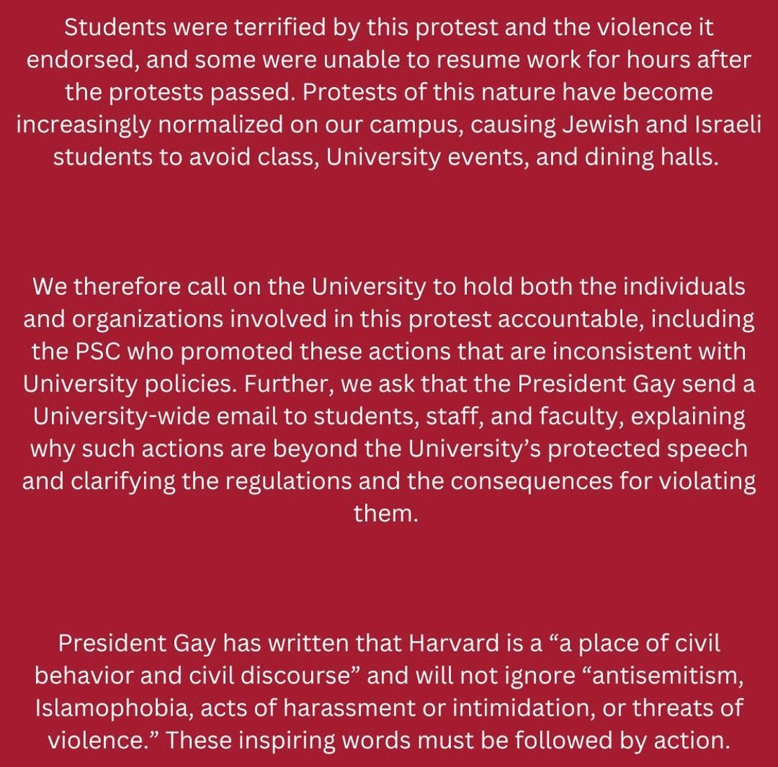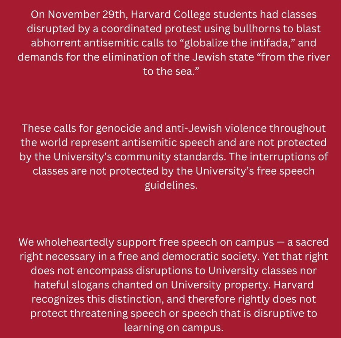 From Harvard Hillel: Wednesday classes disrupted by students with bullhorns chanting "globalize intifada" and "river to the sea." Statement: "protests of this nature have become increasingly normalized on our campus." Urges univ to enforce--as it hasn't done--its own rules. https://t.co/GbZ8OwouRL