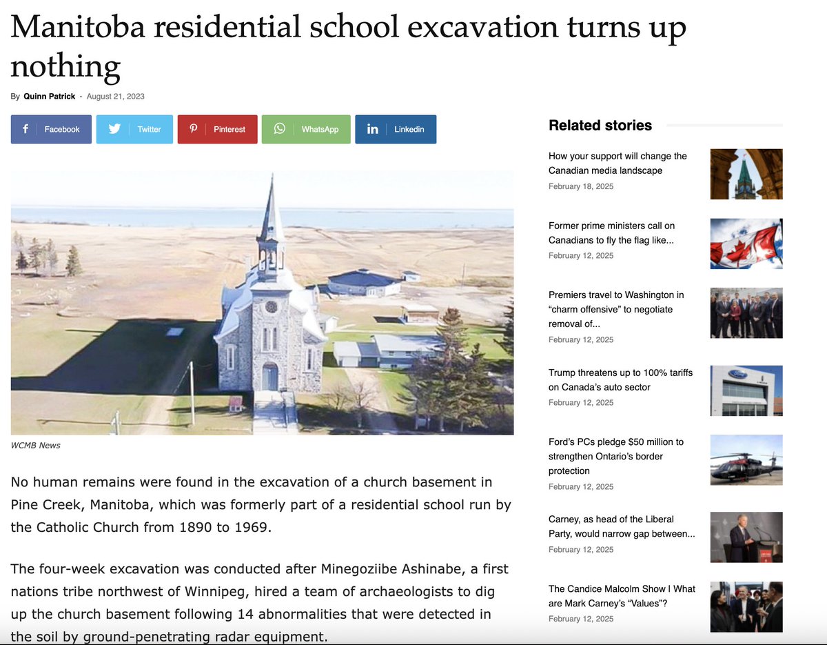 Hoax Confirmed. After claims of "mass graves" of indigenous children at residential schools across Canada, no human remains have been found after 2 years of excavations. Canada didn’t have racial guilt as a founding myth, so it invented a genocidal atrocity to atone for. Remember, 83 churches were burned down or vandalized over this and Trudeau said they deserved it.