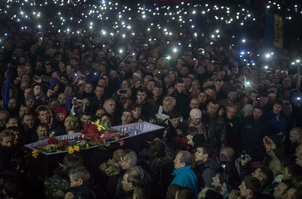 People using lights from their cellphoned during a funeral ceremony at Inpedendence Square in Kyiv, in 2014.