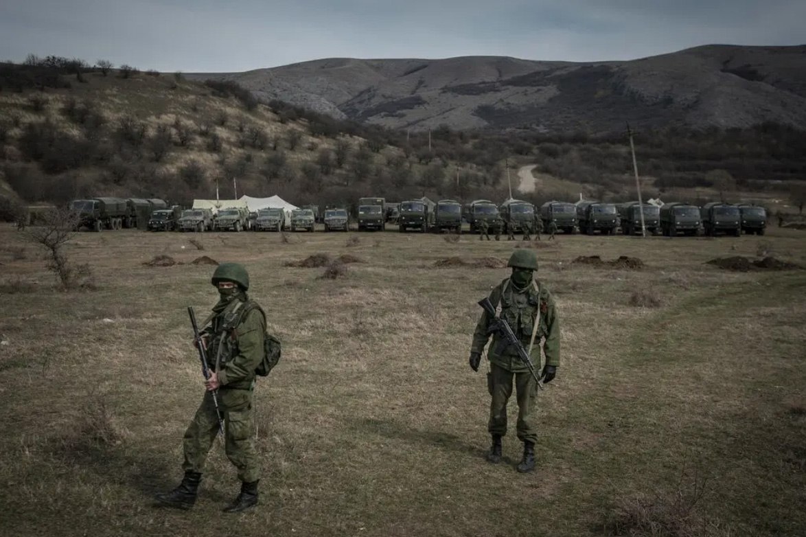 Masked Russian soldiers guarding a Ukrianian military base in Perevalnoe, Crimea, in 2014.