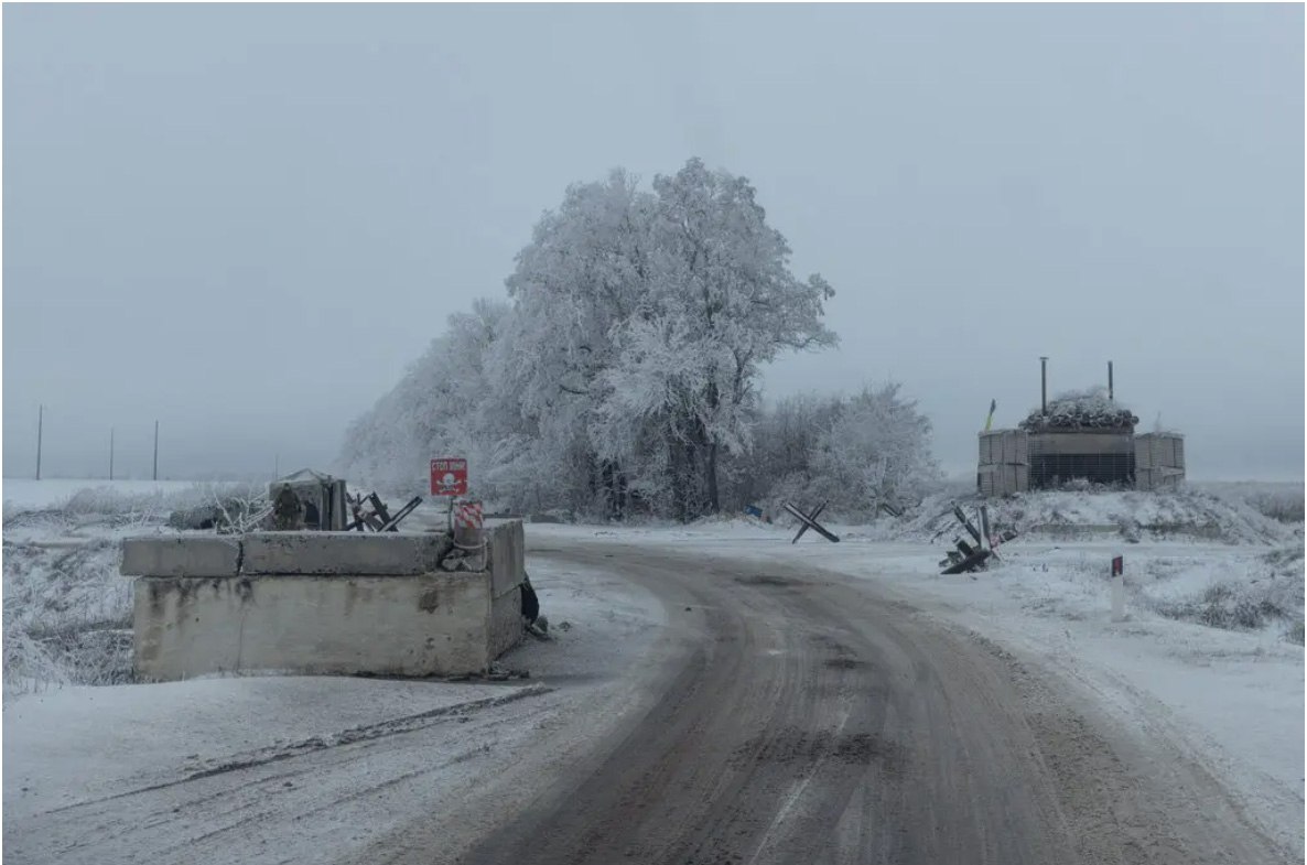 A military checkpoint, with a sign indicating land mines along the roadside, blocking the road to the Russian border in Ukraine's Khrakiv region, in December last year.