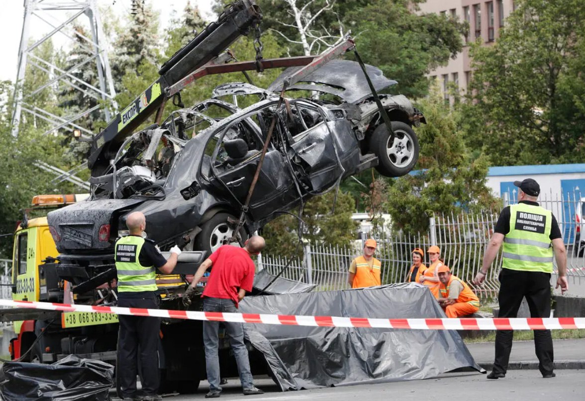 Police officers examining the wreckage of Maksym Shapoval's car after he was killed in an explosion in Kyiv, in 2017.