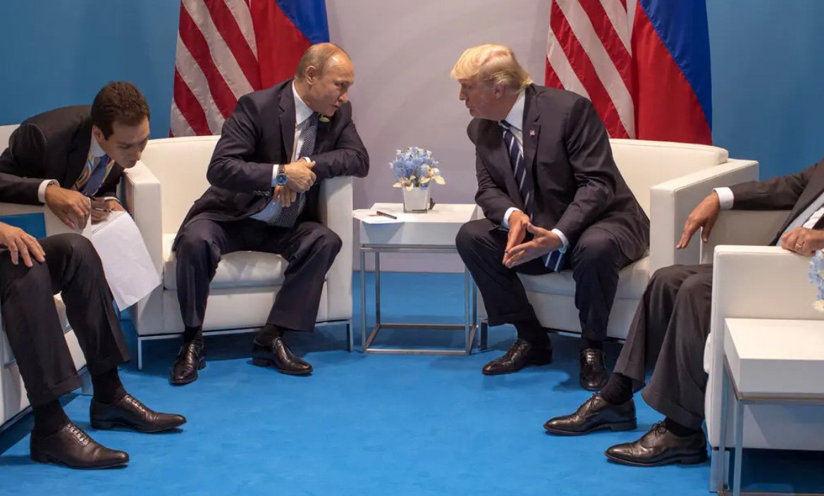 Vladimir V. Putin, the president of Russia, talking with Donald J. Trump, then U.S. president, talking in 2017.