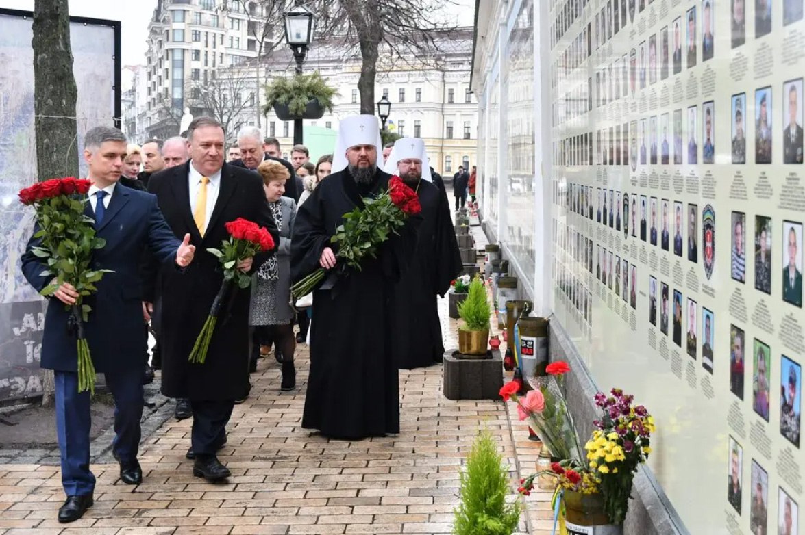 Mike Pompeo, then the U.S. secretary of state, laying flowers at a memorial to Ukrianian soldiers in Kyiv in 2020.
