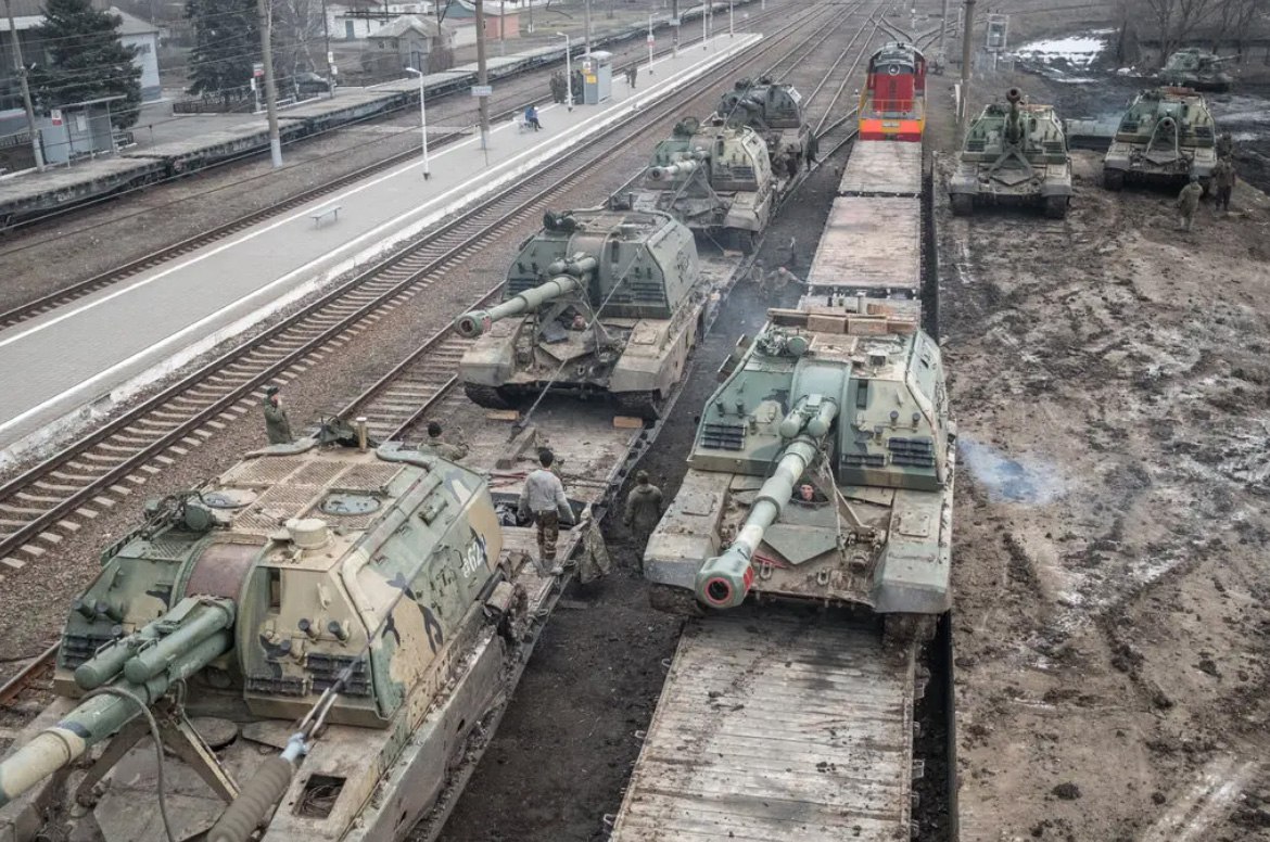 Russian self-propelled howitzers being loaded to the train care at the station outside Taganrog, Russia, days before the invasion in Ukraine.