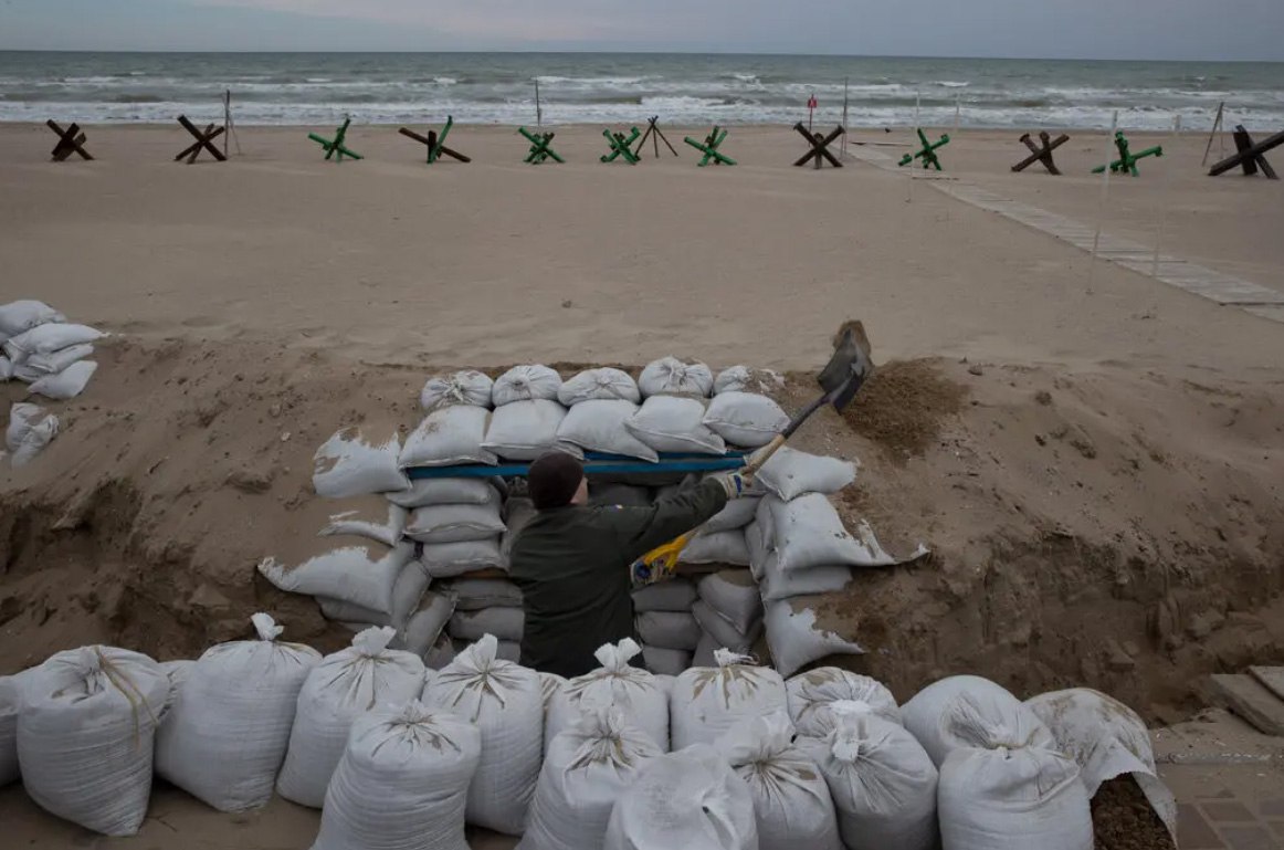 A Ukrainian Army soldier preparing defenses at a beachfront position in Odessa 2022.