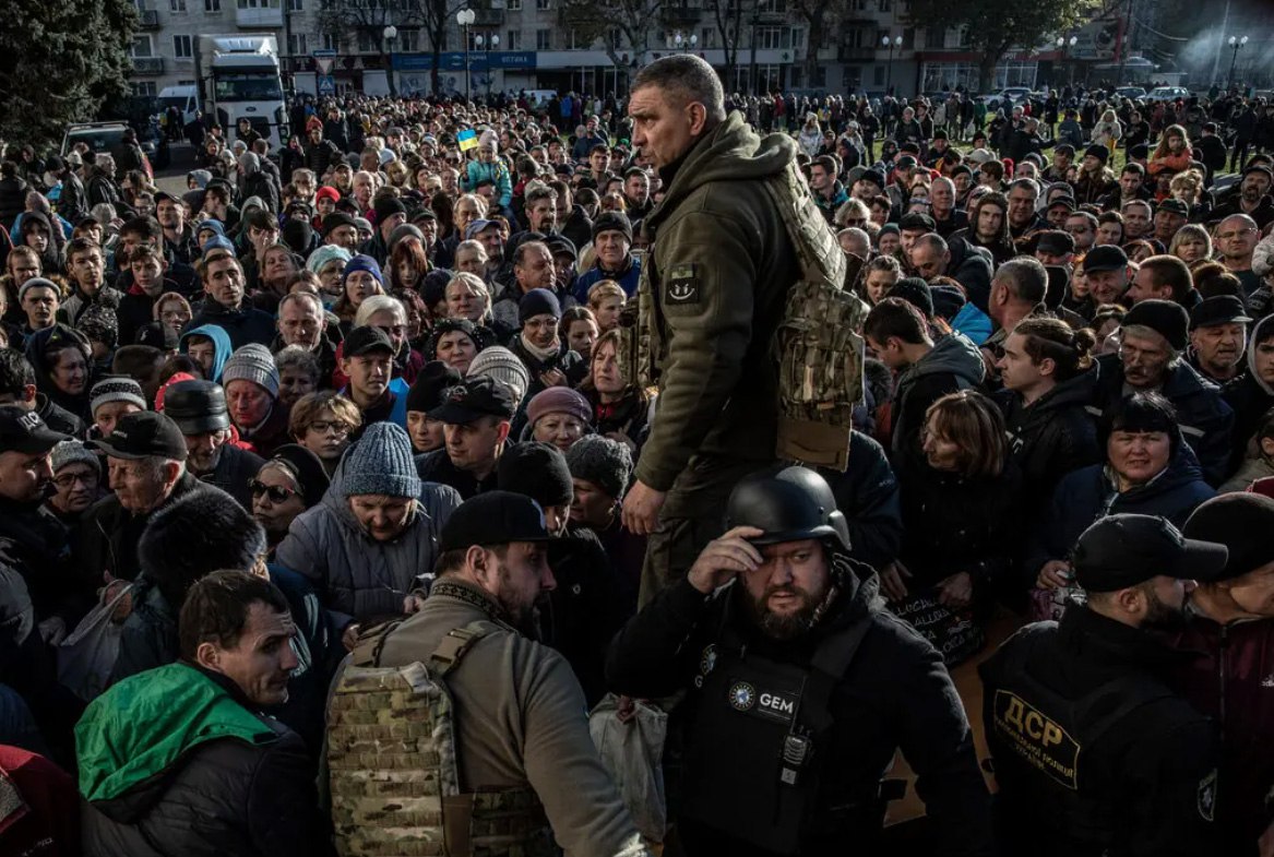 Crowds gathering for food handouts in the southern Ukrainian city of Kherson after it was retaken from Russian occupation, in 2022.