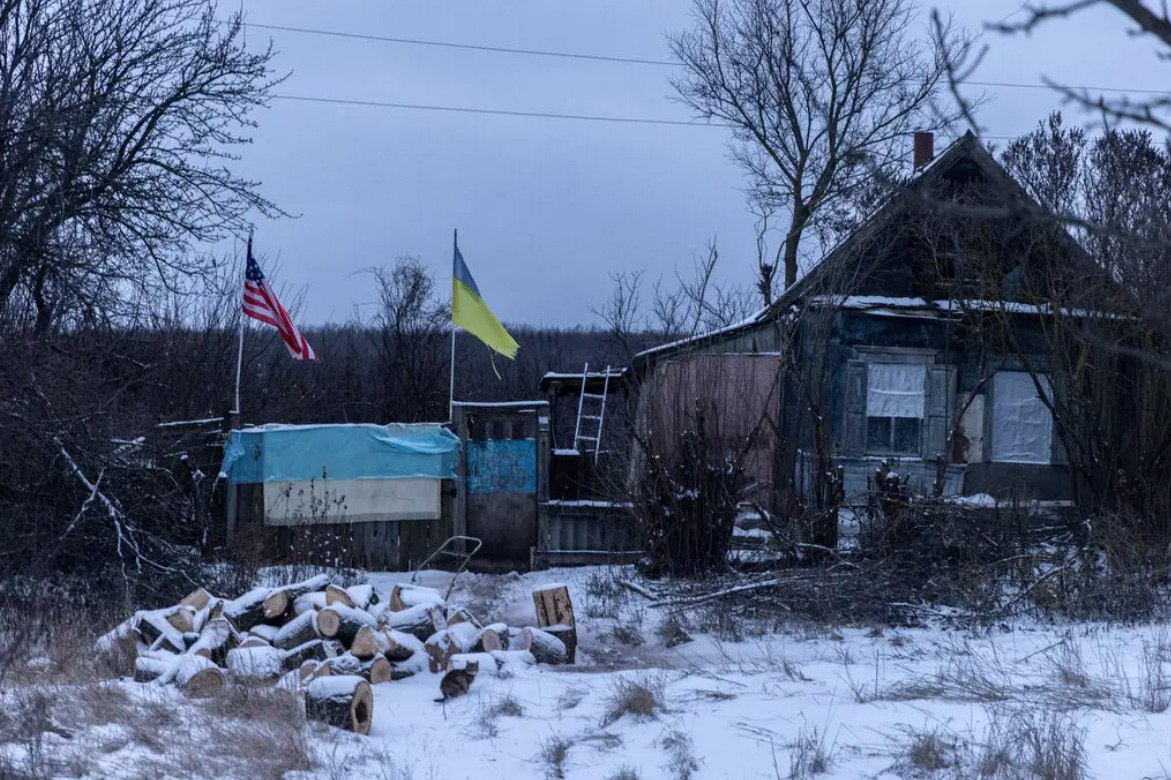 A home, flying Ukrainian and American flags, standing in the destroyed and mostly abandoned village Rubizhne in the Kharkiv region, close to the Russian border, in december. https://t.co/PD7NT3MDkj