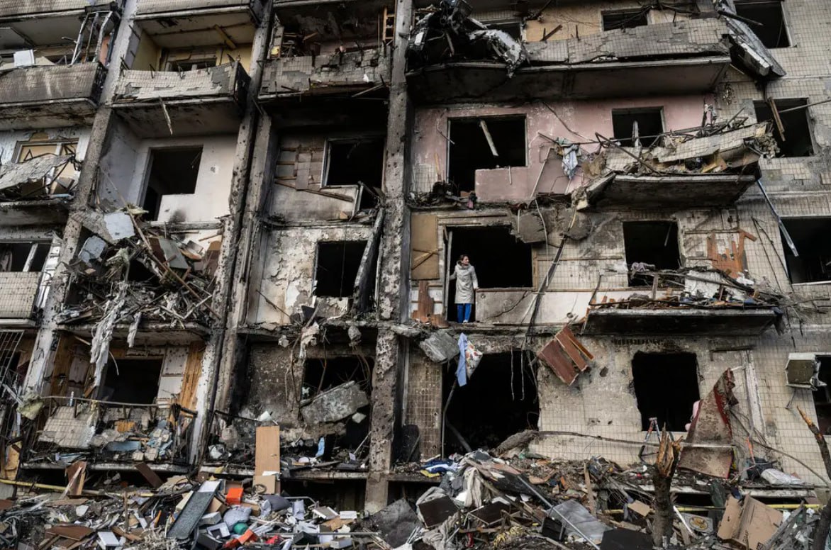 Ukrainians cleaning up debris after a residantial building was hit by missiles in south Kyiv, the day after the 2022 invasion.