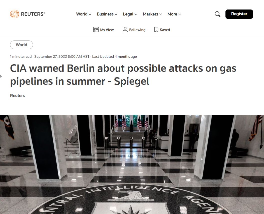 5) The CIA warned authorities in Berlin three months before the Nordstream pipeline was sabotaged of the possibility that someone would destroy the pipelines. I wonder how they knew? https://www.reuters.com/world/cia-warned-berlin-about-possible-attacks-gas-pipelines-summer-spiegel-2022-09-27/