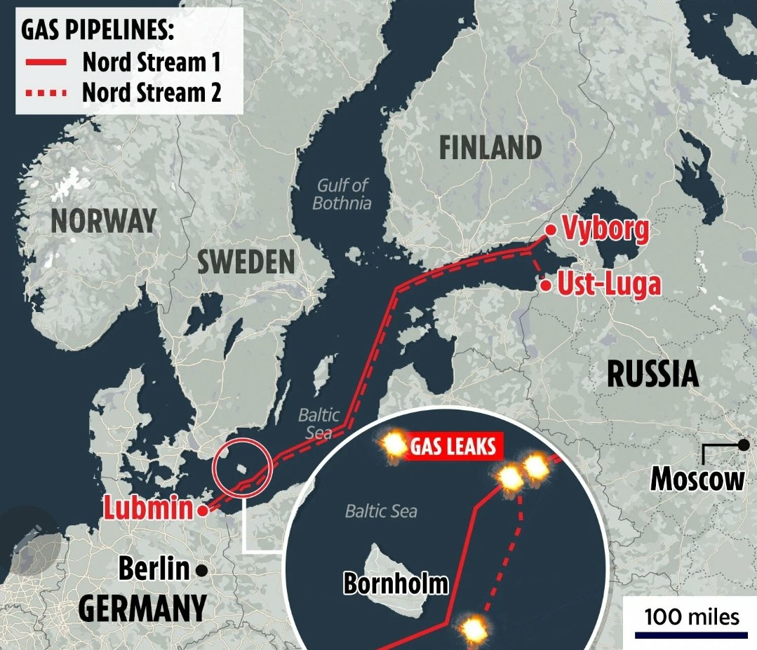 7) The gas pipelines were sabotaged near Bornholm in the Baltic Sea. The leaks occurred in areas where the pipelines lie at sufficiently shallow depths for divers to plant explosives.