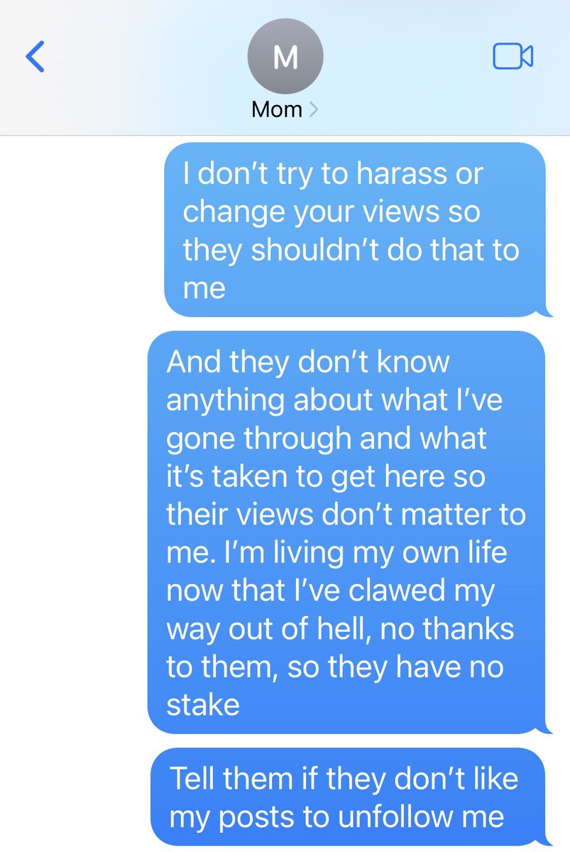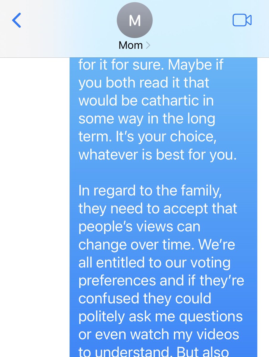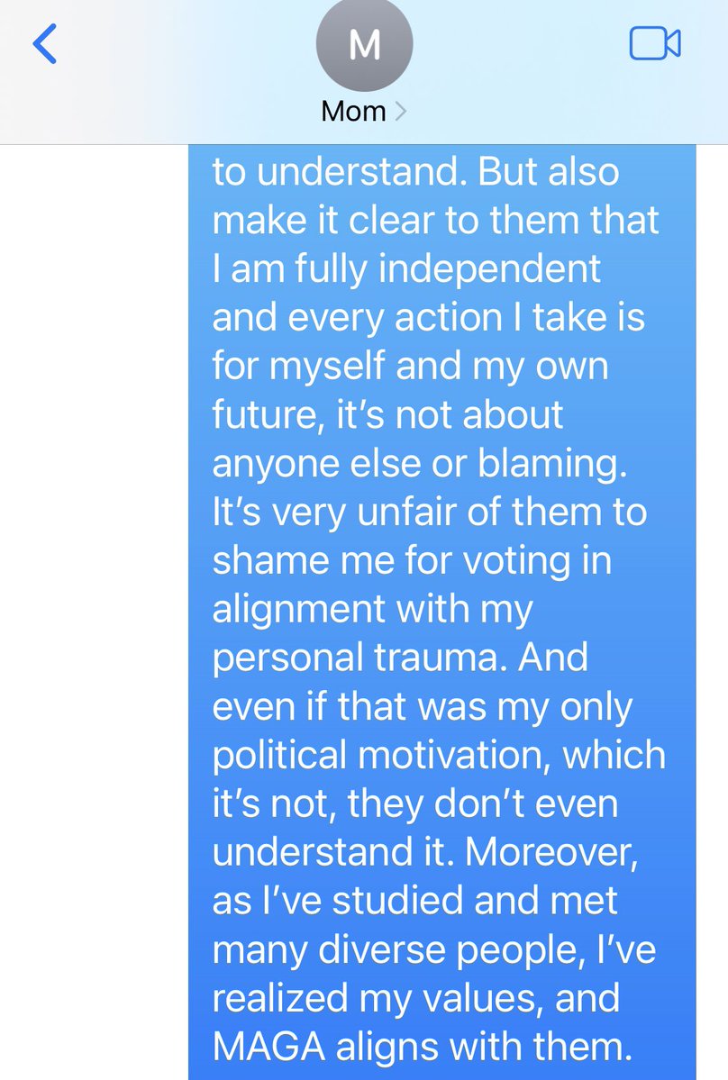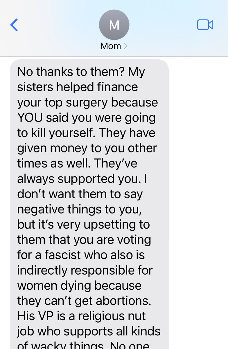🧵I’m a detransitioner endorsing Trump. My family who supported my transition (due to fear of suicide) is horrified. I am posting this frustrating exchange with my mom to model setting and accepting boundaries for others in similar situations: