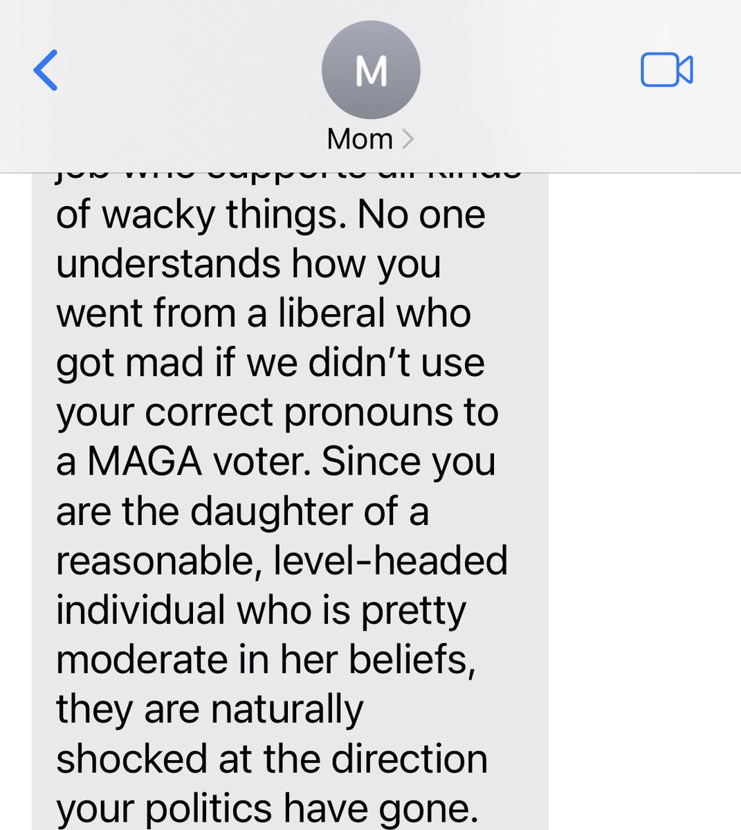 She claims my aunts have always been supportive by giving me money to have my breasts cut off. This is frustrating because the fact my ignorant but well-intended liberal aunts gave money to my medical mutilation IS THE PROBLEM. There was no emotional support or guidance, only supporting the affirmation model. I do NOT blame my aunts for this, we were all ignorant. But it reveals the leftover cognitive dissonance my mom feels about facilitating my surgery. She then goes into political TDS talk.