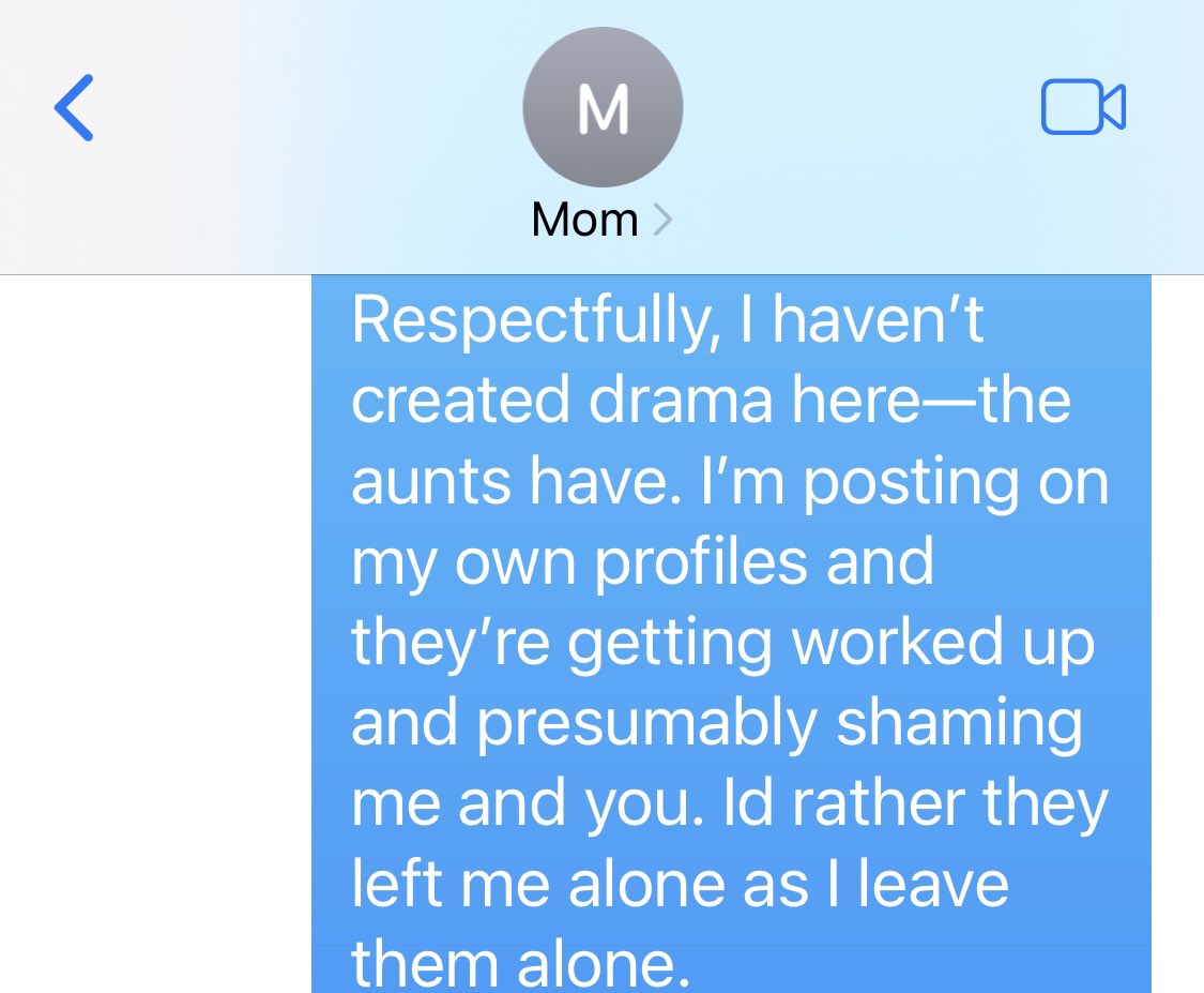 We discussed more personal things that I won’t share, but we resolved the conflict amicably. We agreed to disagree about politics, and that she is proud of my growth and skills, but doesn’t support my politics nor is interested in learning about gender ideology. We agreed the aunts shouldn’t be rude but we can’t control their behavior, and I will hold boundaries with them individually.