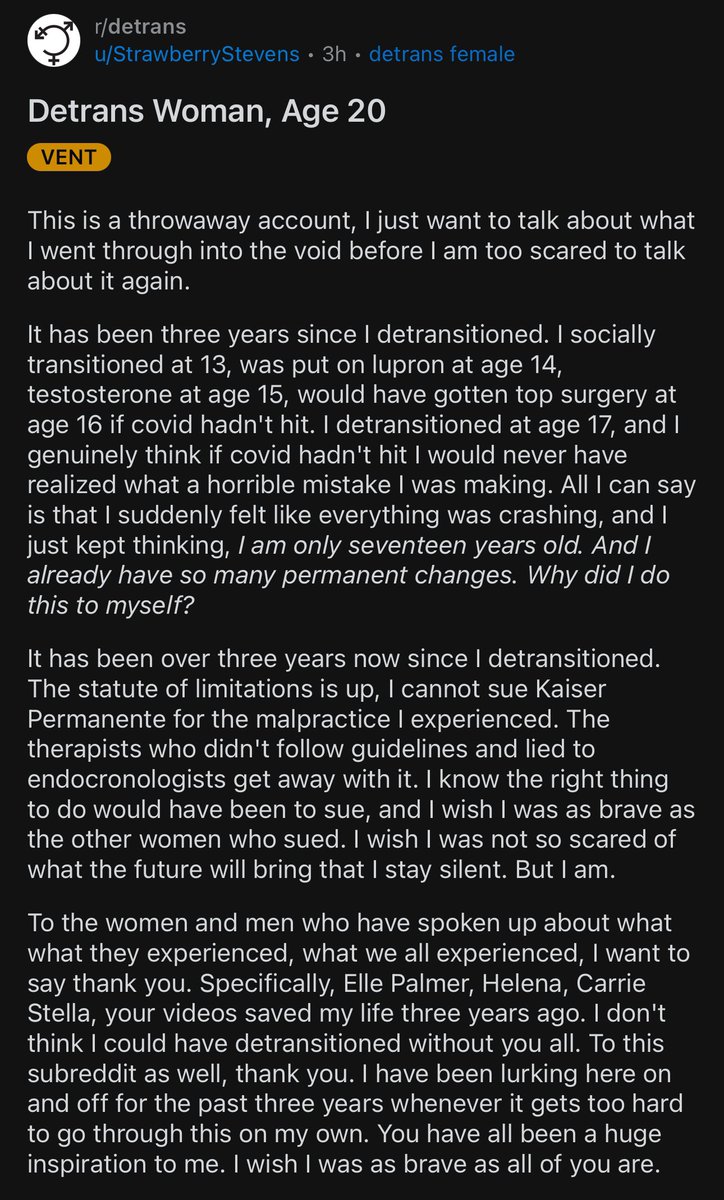 During our live WPATH Files webinar last year, Forrest shared his personal story, beginning with childhood and detailing his journey through adolescence, transition, surgery, regret, and detransition: https://www.youtube.com/watch?v=shuoOdBJ04s https://t.co/ifJeMYz8IB
