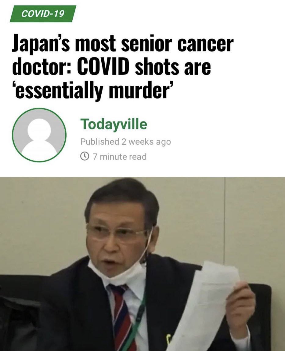 Japans most senior cancer doctor: COVID shots are ‘essentially murder’ https://www.todayville.com/calgary/japans-most-senior-cancer-doctor-covid-shots-are-essentially-murder/