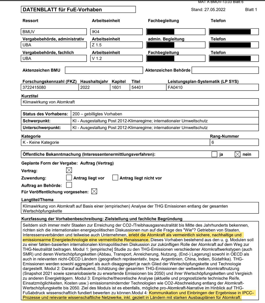 die Erstellung & Verbreitung von Anti-Atom-Gutachten, deren Ergebnisse schon vor der Forschung festgelegt werden, um auch anderswo die Atomkraft zu kritisieren, zu behindern & abzuschaffen. Hauptgutachter übrigens: das Öko-Institut. 4 https://www.bmuv.de/fileadmin/Daten_BMU/Download_PDF/Nukleare_Sicherheit/12_punkte_atomausstieg_bf.pdf