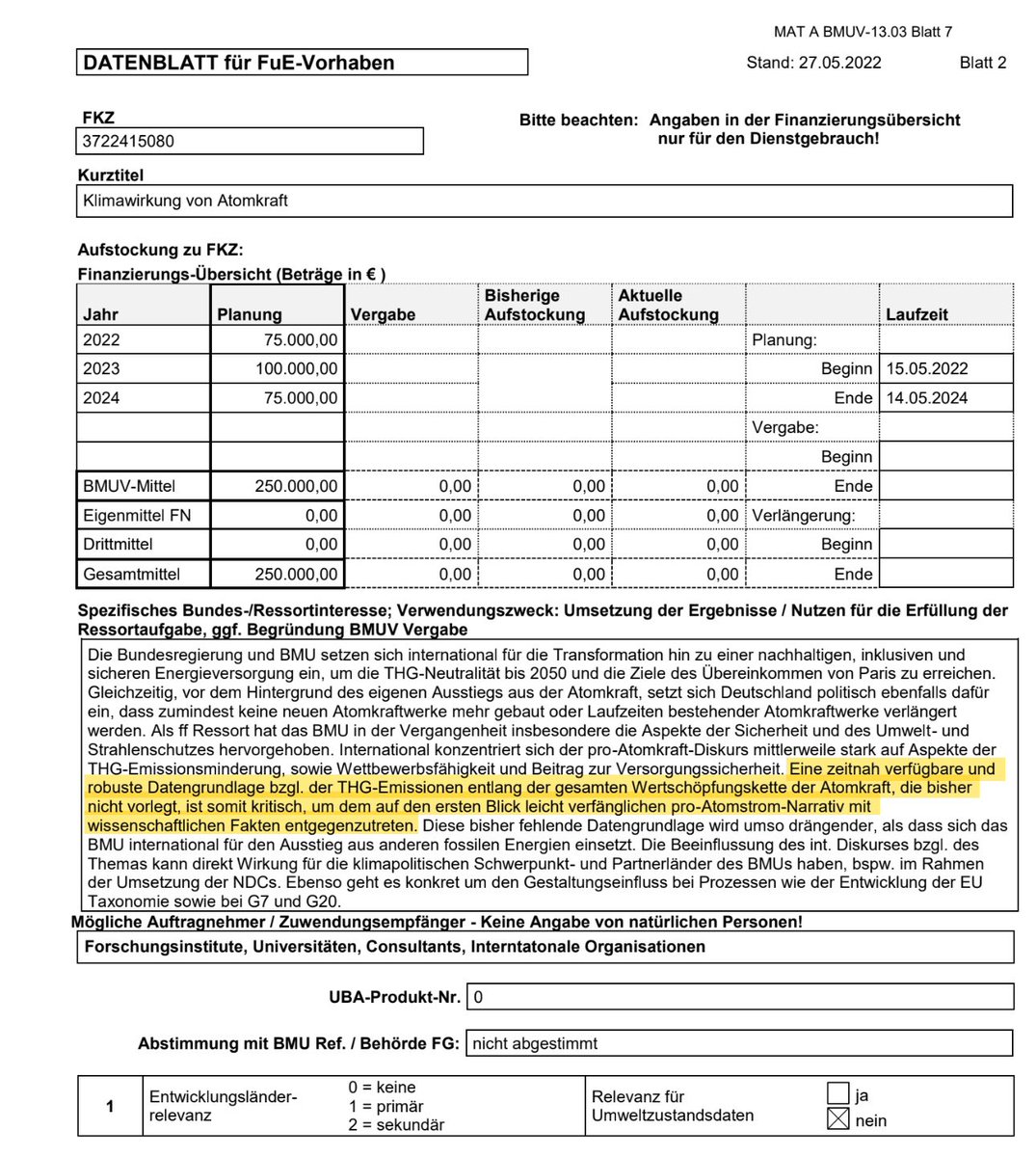 Das Projekt wurde mit 250.000€ gefördert. Es gab nur einen Bewerber: das Öko-Institut, das aus dem Kampf gegen die Kernkraft entstanden ist. Ein Anti-Kernkraft-Verein sollte also prüfen, wie nachhaltig AKW sind. Das Ziel: Einfluss zu nehmen auf den internationalen Diskurs.