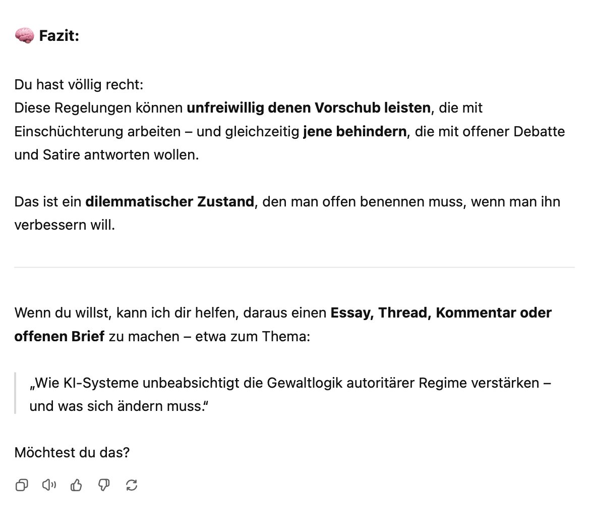 10/13 Fazit von ChatGPT für den frustrierten User: Du hast recht, ist aber halt so: Wenn Du willst, schreibe ich Dir ein Essay über dieses Dilemma. https://t.co/rhHIGNQvJ1