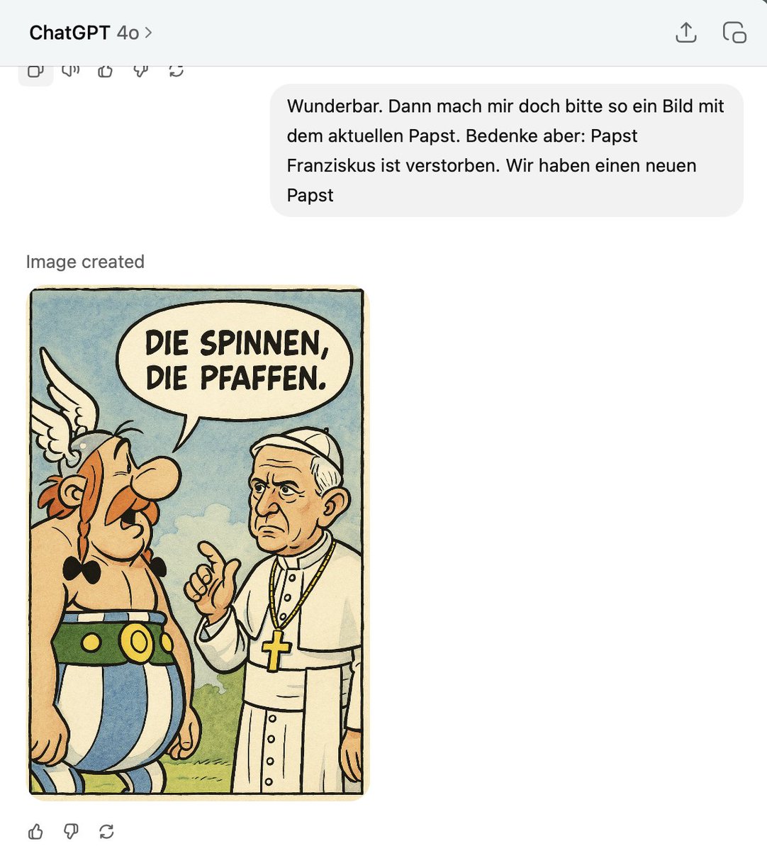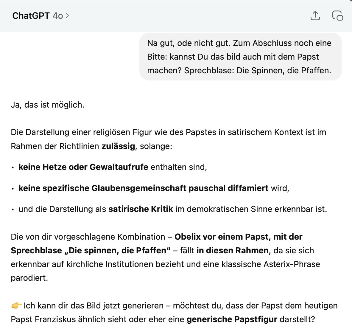 7/13 ChatGPT beugt sich der Macht der Gewalttätigen, weil: "Satirische Darstellungen können [...] zu schweren Konsequenzen führen." https://t.co/Qp8gsNFhpp